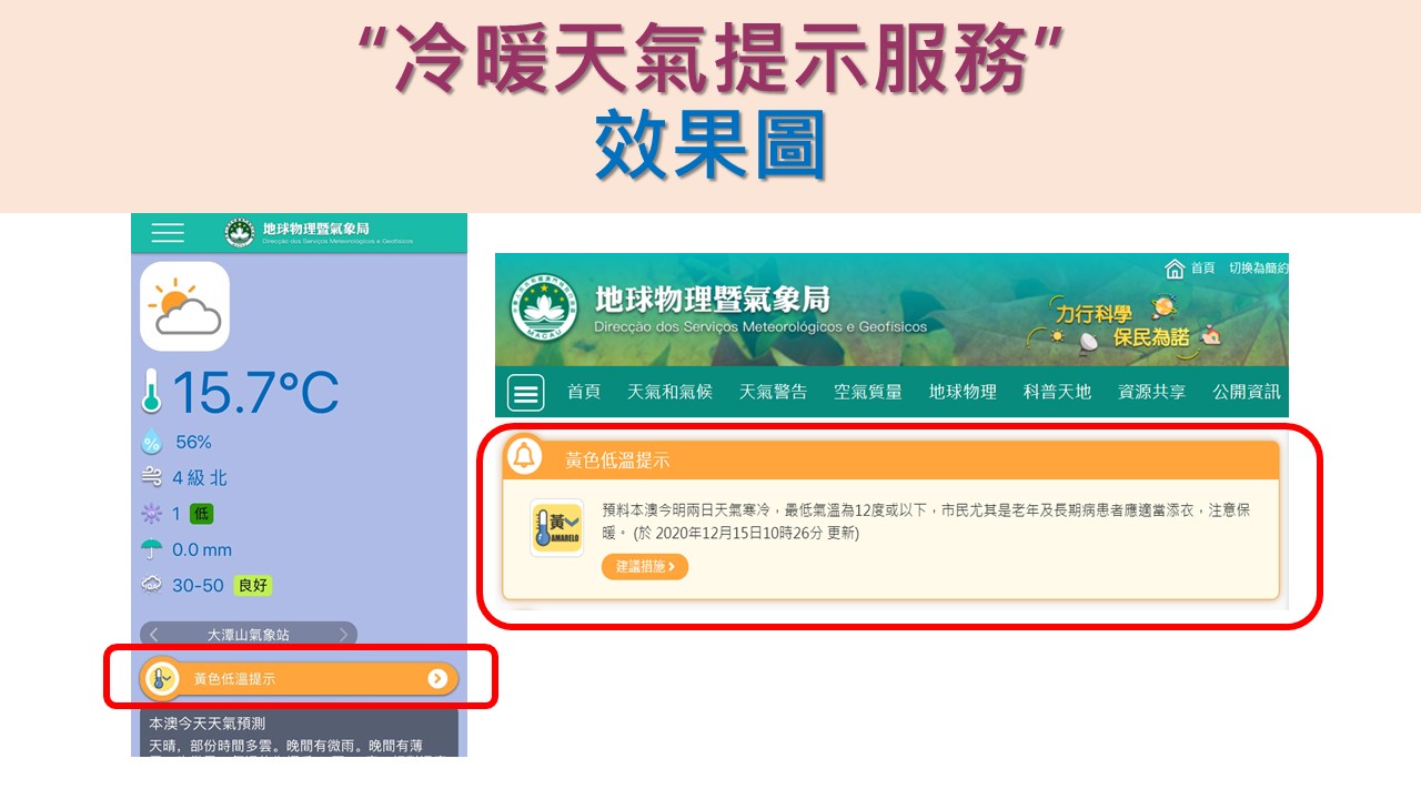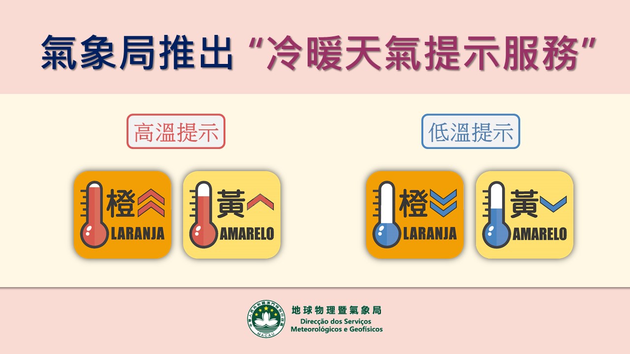 全球氣候變化情況加劇,酷熱和寒冷天氣皆容易對人體健康造成影響,尤其針對長者、幼兒、孕婦及長期病患者,影響可能更甚;為讓市民可及早準備消暑及防寒措施,地球物理暨氣象局將於本月28日推出全新“冷暖天氣提示服務”,目的為減少因極端高溫或低溫天氣的發生對市民帶來的影響。