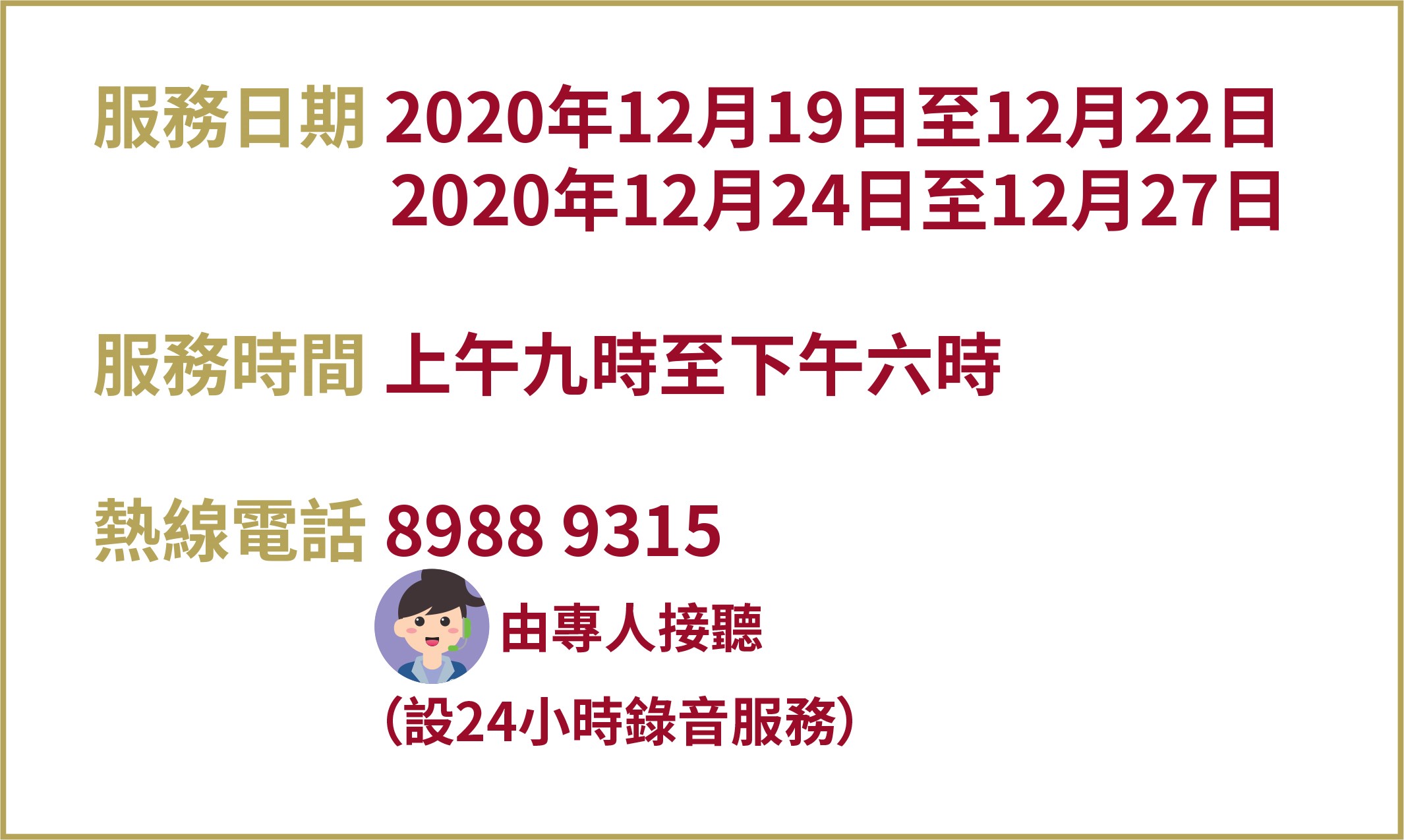 消費者委員會配合即將來臨的澳門特別行政區成立紀念日、冬至及聖誕節假期,為向消費者提供適時的服務,特設假期電話熱線服務,派員接聽消費者的投訴及諮詢電話,在有需要的情況下,為消費者提供相應協助。