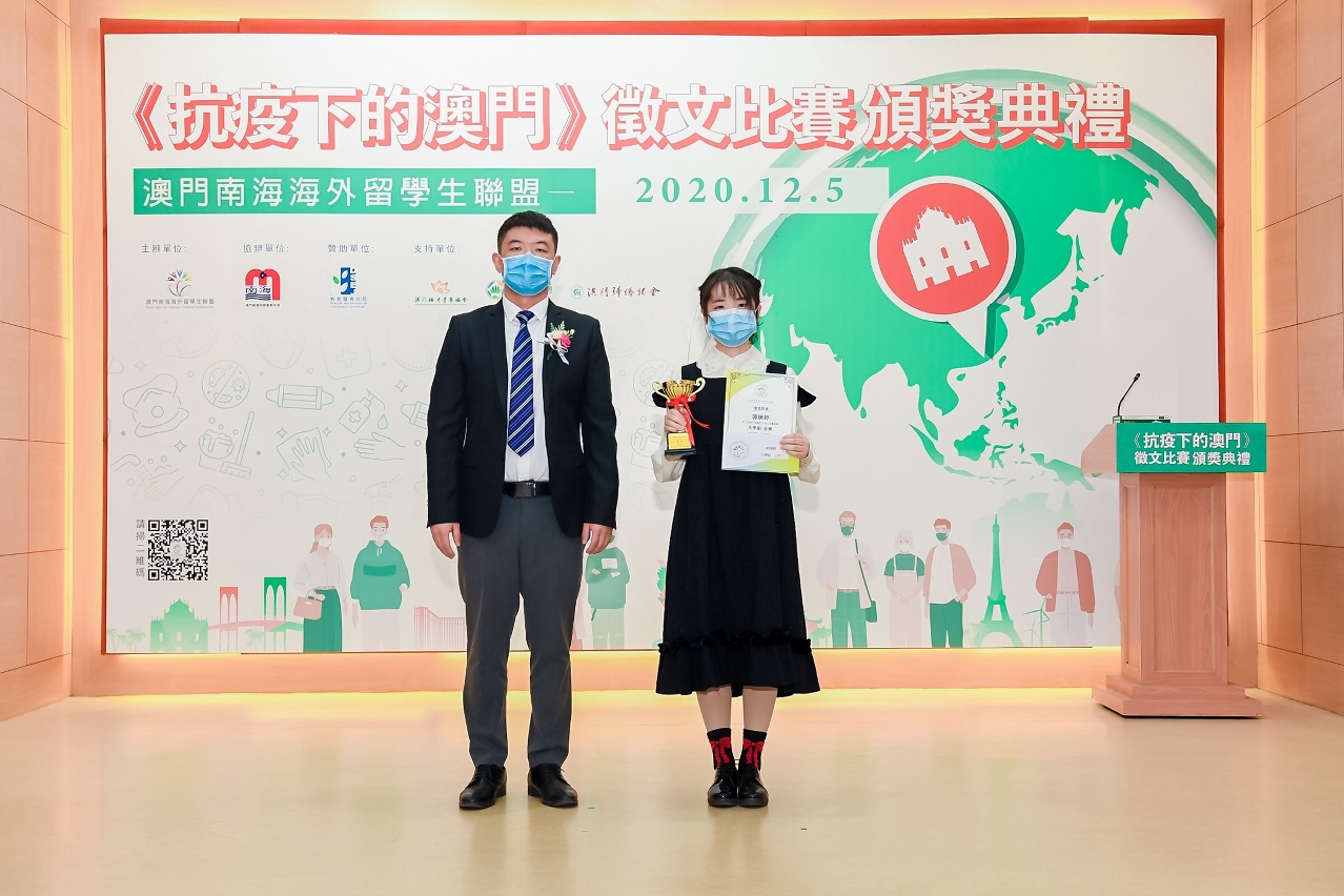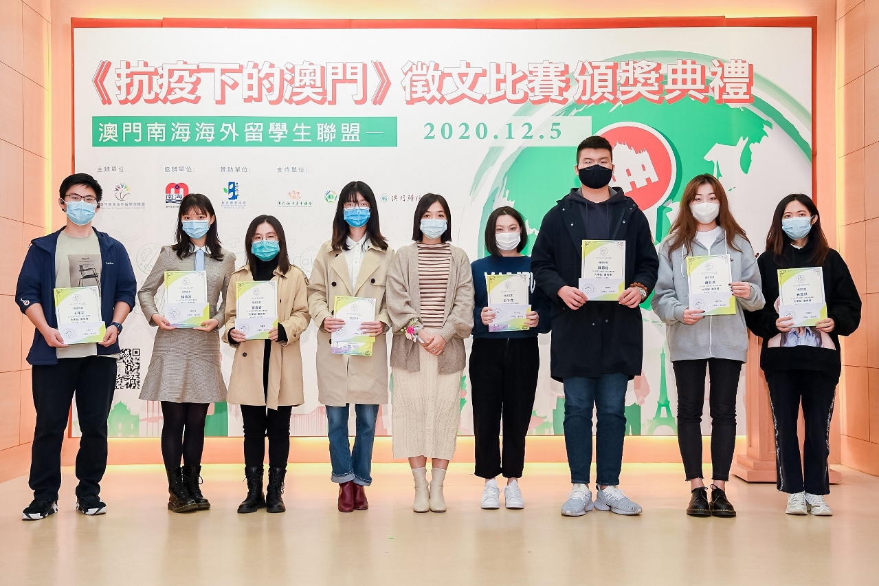 由澳門南海海外留學生聯盟主辦的《抗疫下的澳門 》徵文比賽於2020年12月5日舉行了頒獎典禮,是次活動冀讓澳門學生及青年透過寫作記錄及抒發自己在抗疫期間的感受和經歷。三名澳旅院學生在大學組中獲得金、銅及優異獎,金獎學生是就讀酒店及旅遊管理碩士課程的郭琬婷、銅獎學生是就讀酒店管理本科課程的余晨露,以及優異奬學生為就讀旅遊企業管理本科課程的彭千瀅。