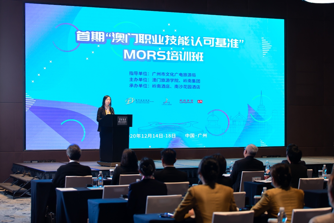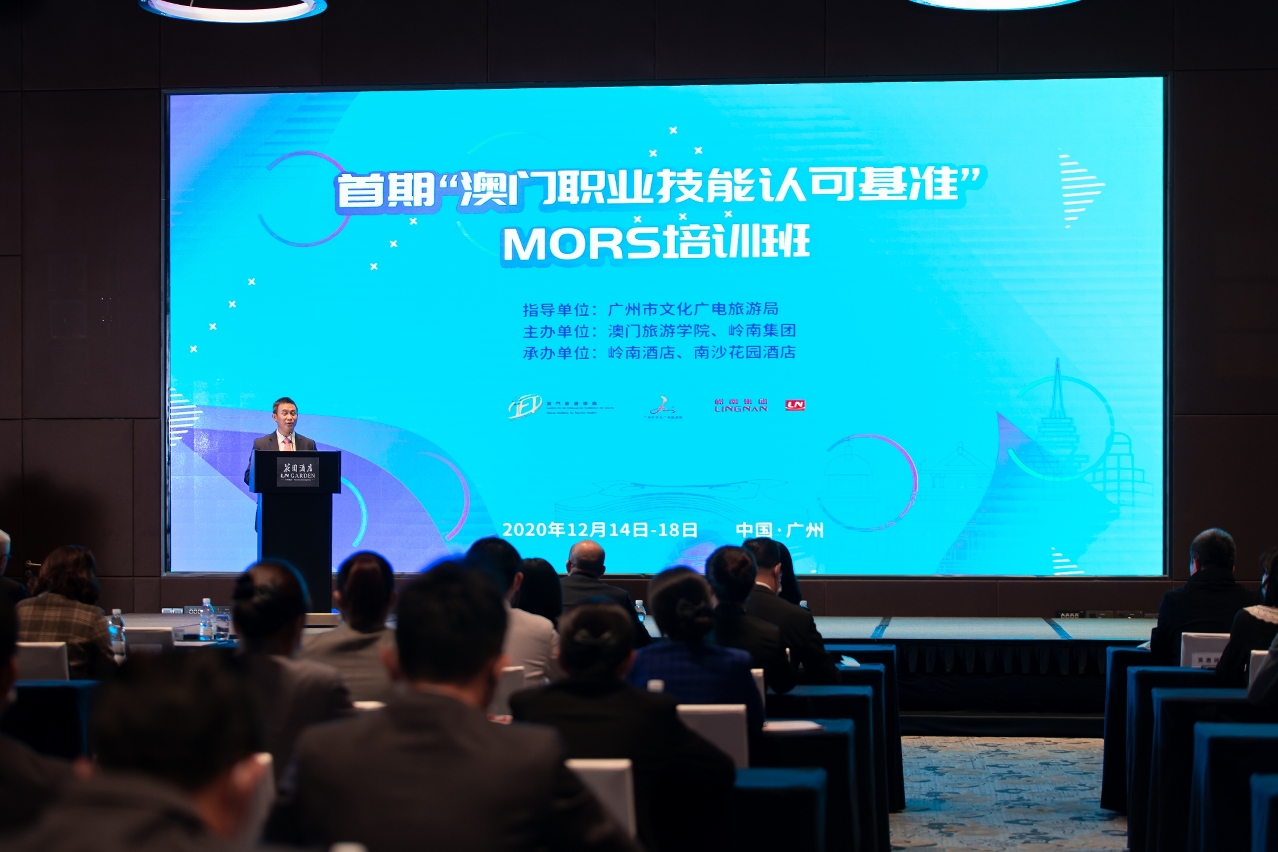 為全面把握粵港澳大灣區戰略發展機遇,深入貫徹落實習近平總書記致首屆全國職業技能大賽賀信精神,大力弘揚勞模精神、勞動精神、工匠精神,在全國政協副主席何厚鏵、廣州市委主要領導關心支持下,12月14日,廣州市文化廣電旅遊局、澳門旅遊學院、嶺南集團聯合將 “澳門職業技能認可基準MORS”培訓及評核體系引入廣州,並在南沙花園酒店舉辦廣州地區首期澳門職業技能認可基準培訓班開班儀式。本期MORS培訓班是澳門、廣州兩地旅遊行業校企合作、產業合作,實現多方面多層次戰略合作的首個落地項目。