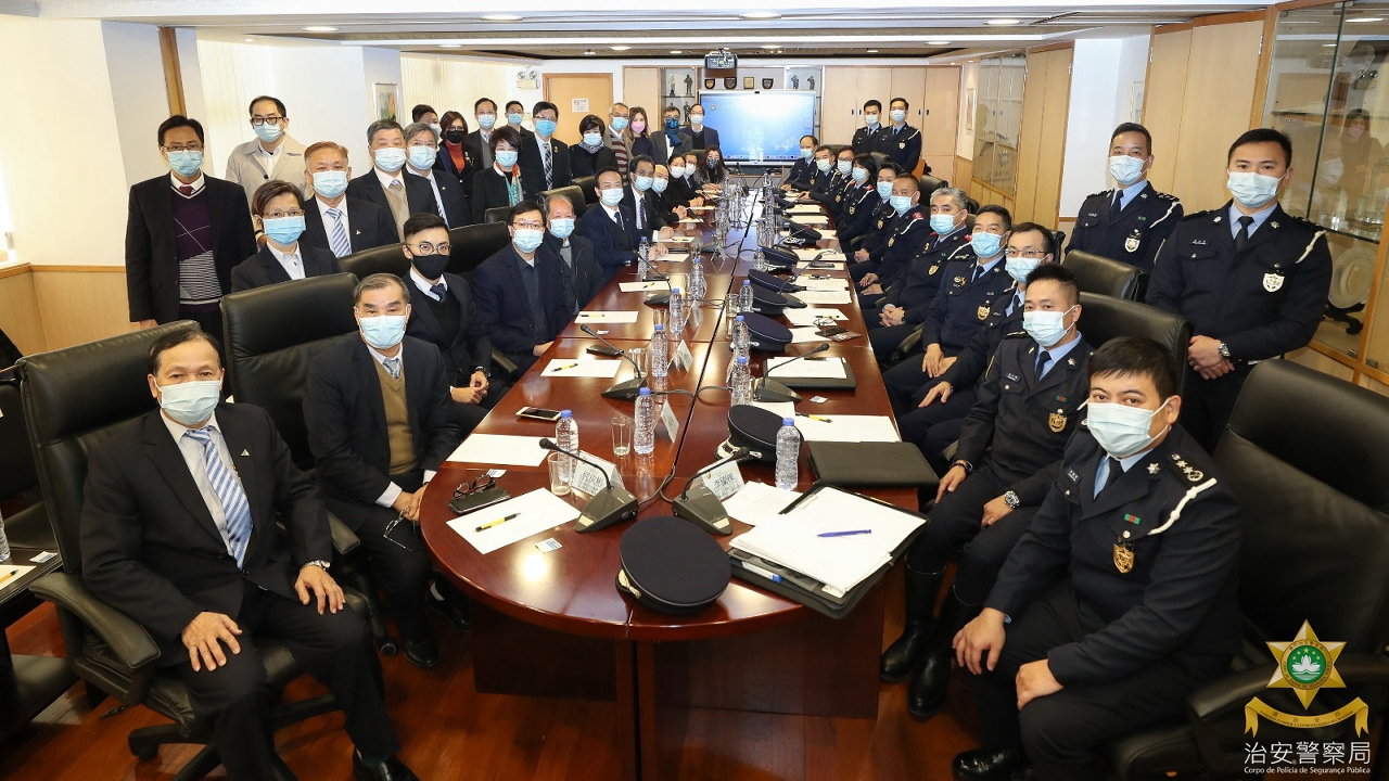 1月12日下午,治安警察局吳錦華局長,以及黃偉鴻、梁慶康、伍素萍三名副局長帶領多名主管在治安警察局總部,接待到訪的澳門物業管理業商會劉藝良會長、澳門街坊會聯合總會林文彬副監事長、澳門不動產管理專業技術人員協會楊永泰會長等約三十位社團代表,就冬防工作進行座談。