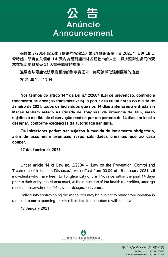 新型冠狀病毒感染應變協調中心宣佈,因應吉林省的最新疫情發展,衛生局根據第2/2004號法律《傳染病防治法》第14條的規定,自2021年1月18日零時起,所有在入境前14天內曾經到過吉林省通化市或長春市的公主嶺市范家屯鎮的人士,須按照衛生當局的要求在指定地點接受14天醫學觀察,違反者除可能依法承擔相應的刑事責任外,尚可被採取強制隔離的措施。
