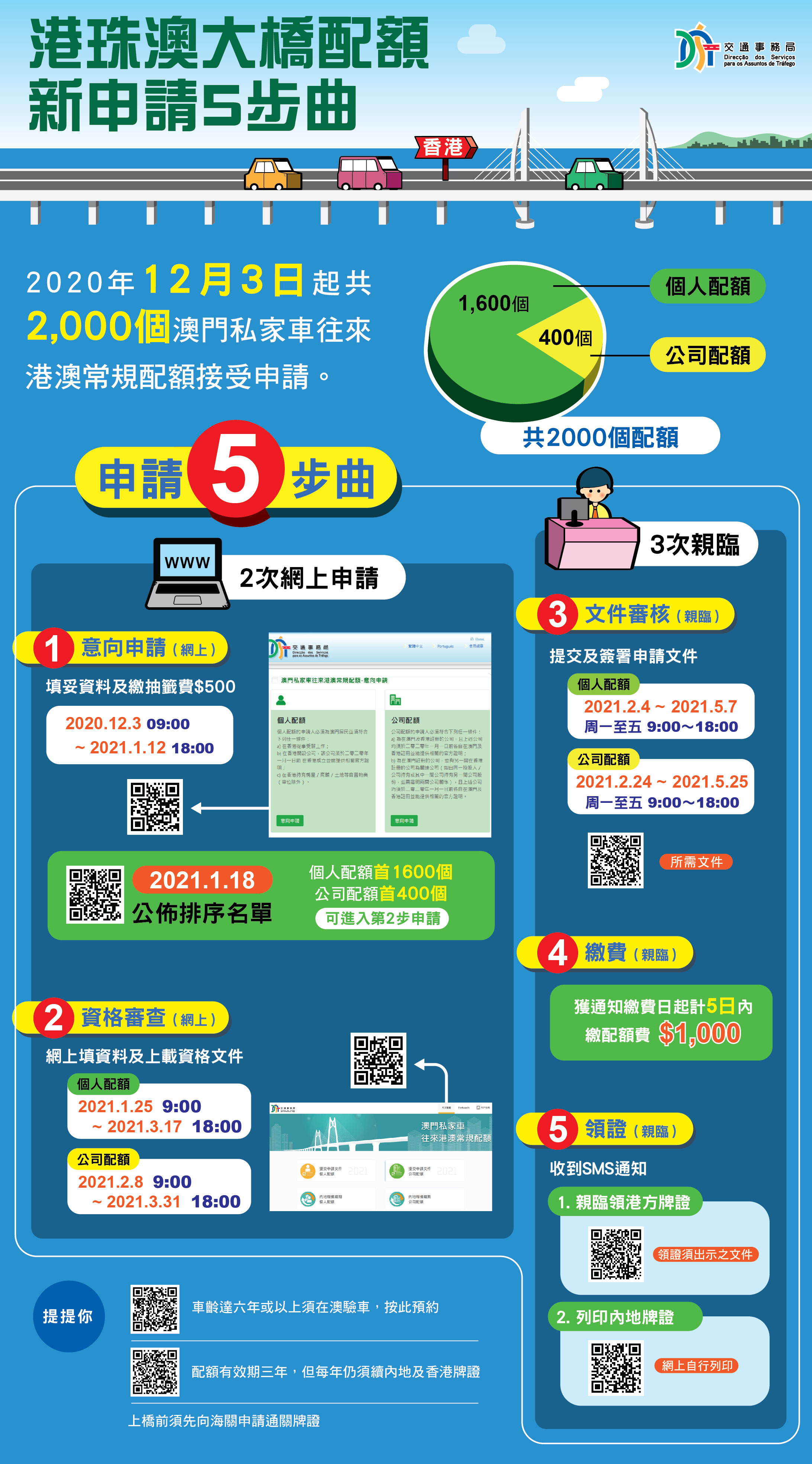 按抽籤排序,首1,600個個人配額及首400個公司配額的申請人將收到局方的提示短訊,相關申請人須於指定時間透過網上及親臨馬交石服務專區遞交文件及繳費。逾期未提交文件或繳費者被視為放棄相關配額,局方不接受任何情況下之逾期補交或繳費,並將按是次抽籤結果依次替補。抽籤名單及手續可查閱局方網頁http://www.dsat.gov.mo/hzmb/car_cross.aspx。
