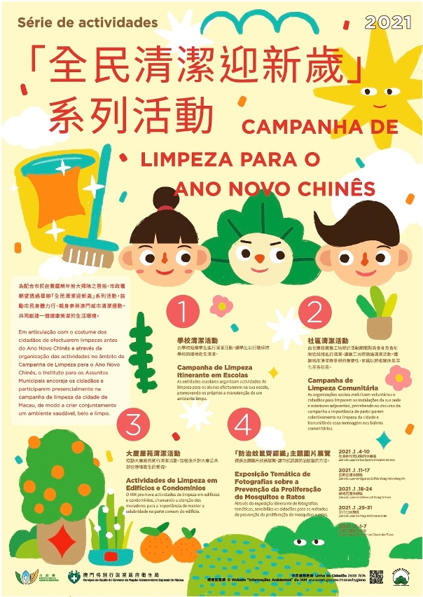 為配合市民在農曆新年前大掃除之習俗,市政署與衛生局合作,聯同本澳多個團體於一至三月期間舉辦「全民清潔迎新歲」系列活動,鼓勵市民身體力行,親身參與城市清潔活動,藉此加深對維護環境衛生工作的認識,並了解在疫情期間保持家居、校園及社區清潔的重要性。
