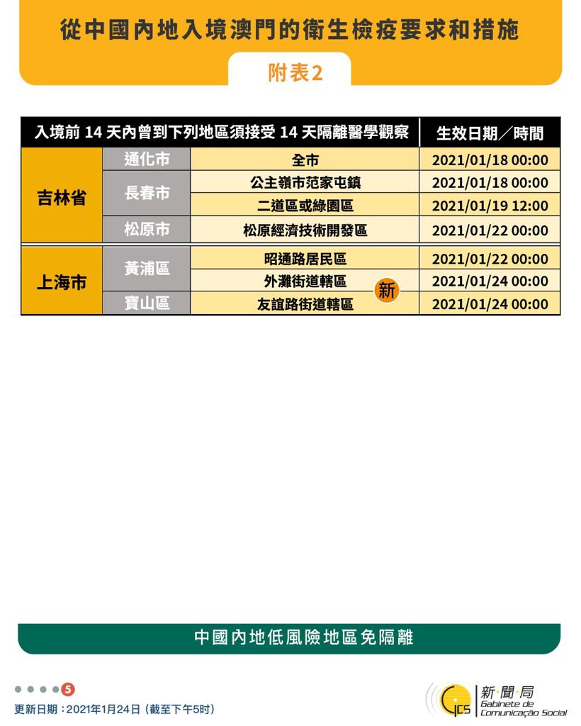 1月25日零時起曾到上海市黃浦區南京東路街道轄區或吉林省松原市寧江區的人士須接受14天醫學觀察以及最少14天自我健康管理