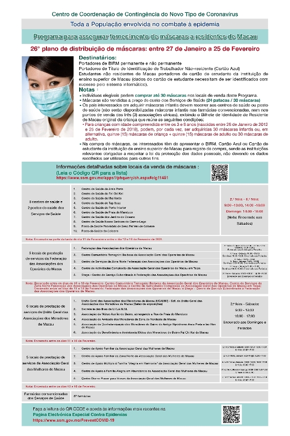 新型冠狀病毒感染應變協調中心今(25)日公佈,第26輪保障口罩供應澳門居民計劃於週三(27日)開始,售賣期間為30日,即2021年1月27日至2月25日,期間每人可一次性購買30個口罩,售價合共24澳門元。對象包括本澳永久及非永久居民、持外地僱員身份認別證(俗稱藍咭)人士,以及持澳門各高等院校學生證的非本地學生,學生在購買口罩時須出示所就讀高等院校的學生證,經系統成功識別學生證資料後方能購買。