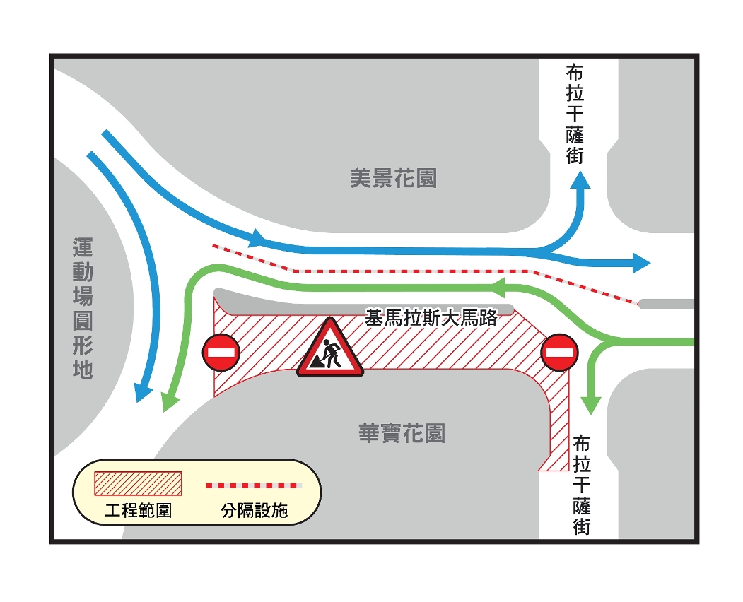 配合靠近美景花園的一段基馬拉斯大馬路重鋪路面工程即將完成,土地工務運輸局將展開下一階段靠近華寶花園一側的基馬拉斯大馬路重鋪路面工程。由本周四(1月28日)起介乎運動場圓形地與布拉干薩街、靠近華寶花園一側的一段基馬拉斯大馬實施封閉交通,近美景花園一側則臨時改作雙向行車,上述路段的重鋪路面工作預計於2月初完成。
