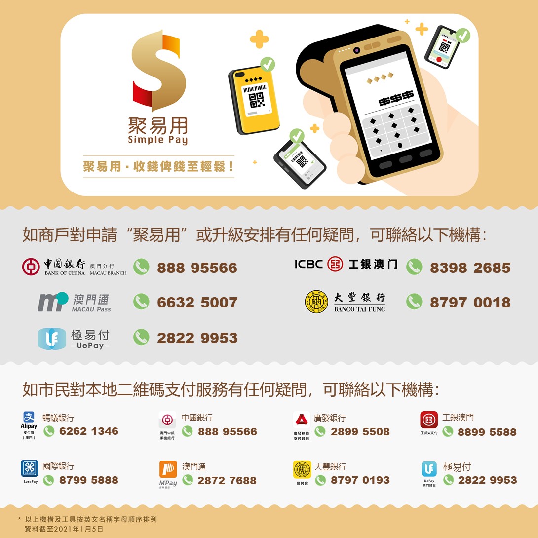 公眾如對“聚易用”有查詢,可聯絡相關金融機構,亦可瀏覽“聚易用”聚合支付專題網頁( https://www.amcm.gov.mo/zh/news-and-announcements/simplepay )。