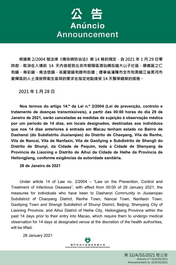 新型冠狀病毒感染應變協調中心宣佈,因應河北省的最新疫情發展,衛生局根據第2/2004號法律《傳染病防治法》第14條的規定,自2021年1月29日零時起,所有在入境前14天內曾經到過河北省保定市的定州市西城區龐白土新民居北區的人士,須按照衛生當局的要求在指定地點接受14天醫學觀察以及最少14天自我健康管理,違反者除可能依法承擔相應的刑事責任外,尚可被採取強制隔離的措施。