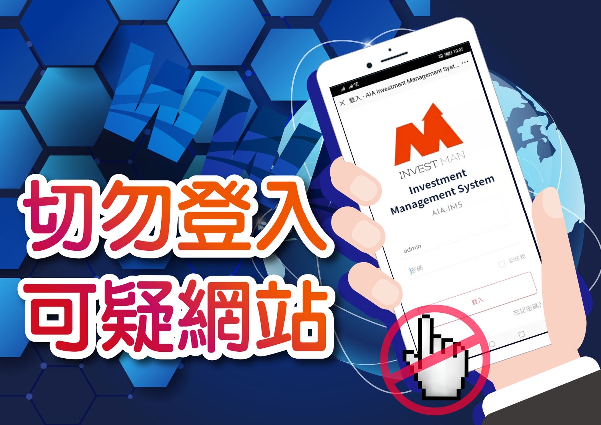 司法警察局接獲友邦保險控股有限公司澳門分公司反映,指近日在互聯網上出現自稱是“AIA Investment Management System”(友邦投資管理系統)的懷疑偽冒網站,其網址是“aia-ims.morestar.com.hk”,而友邦保險控股有限公司的真實網址應為“www.aia.com”。該公司總部已就此事向香港警方報案。