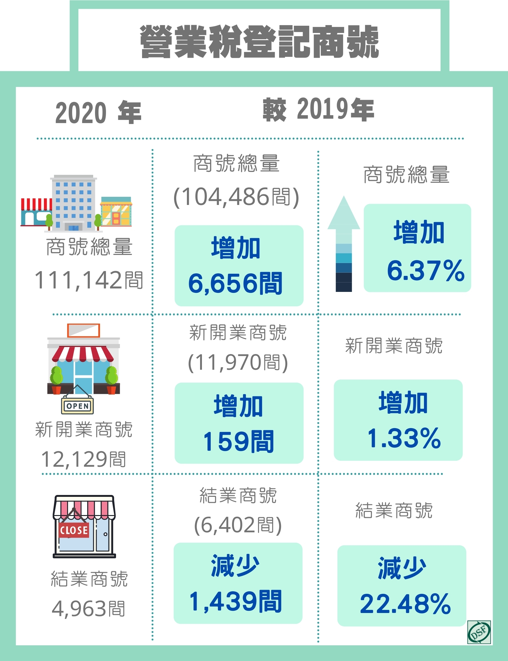 2020全年在財政局營業稅登記的商號累計約111,142間,較2019年的104,486間增加6,656間,同比增加6.37 %。