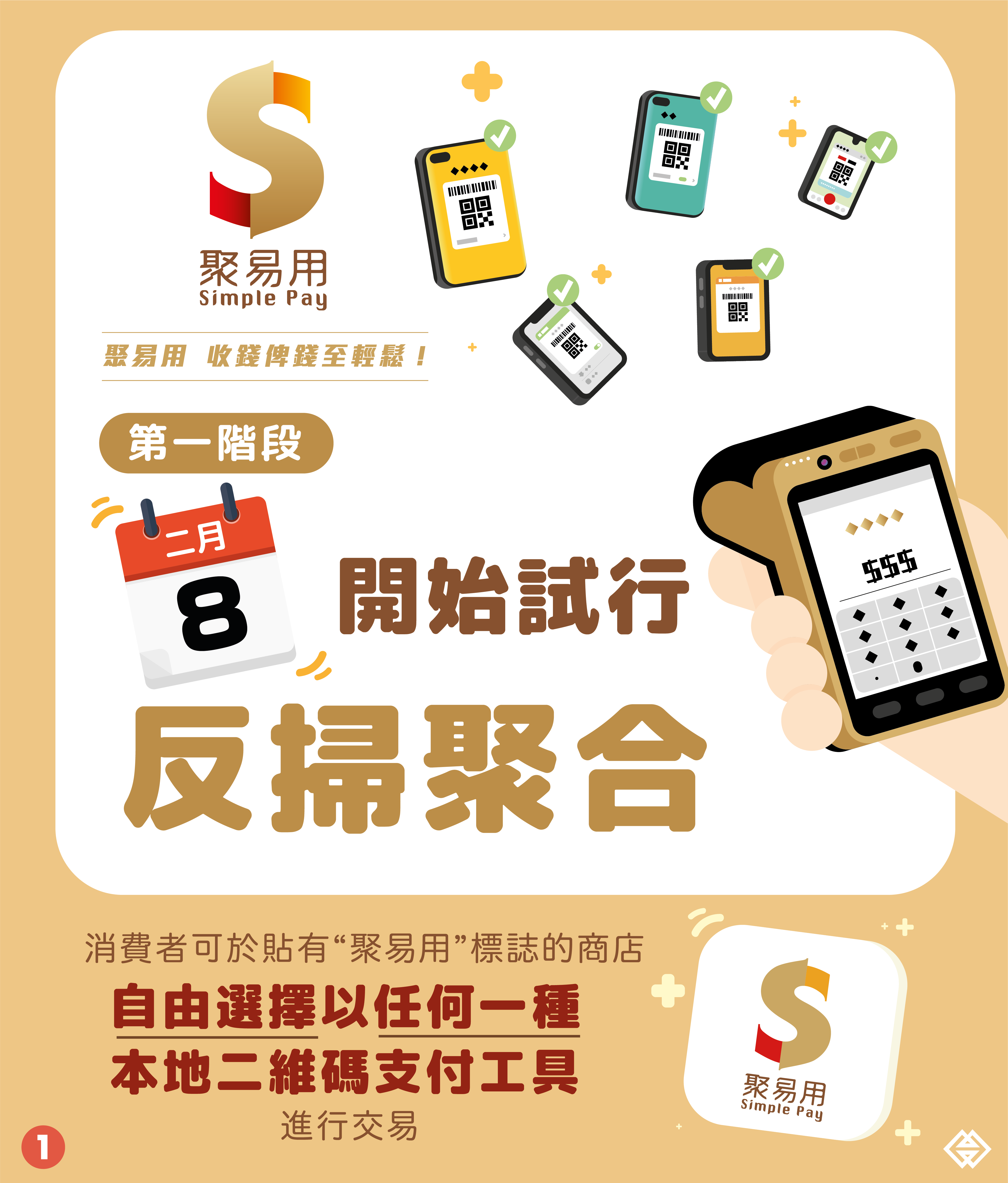 “聚易用”的首階段“反掃聚合”將於2月8日推出試行,市面上將陸續出現受理“聚易用”的商戶,屆時,消費者可於貼有“聚易用”標誌的商店,選擇任何一種本地二維碼支付工具進行交易。