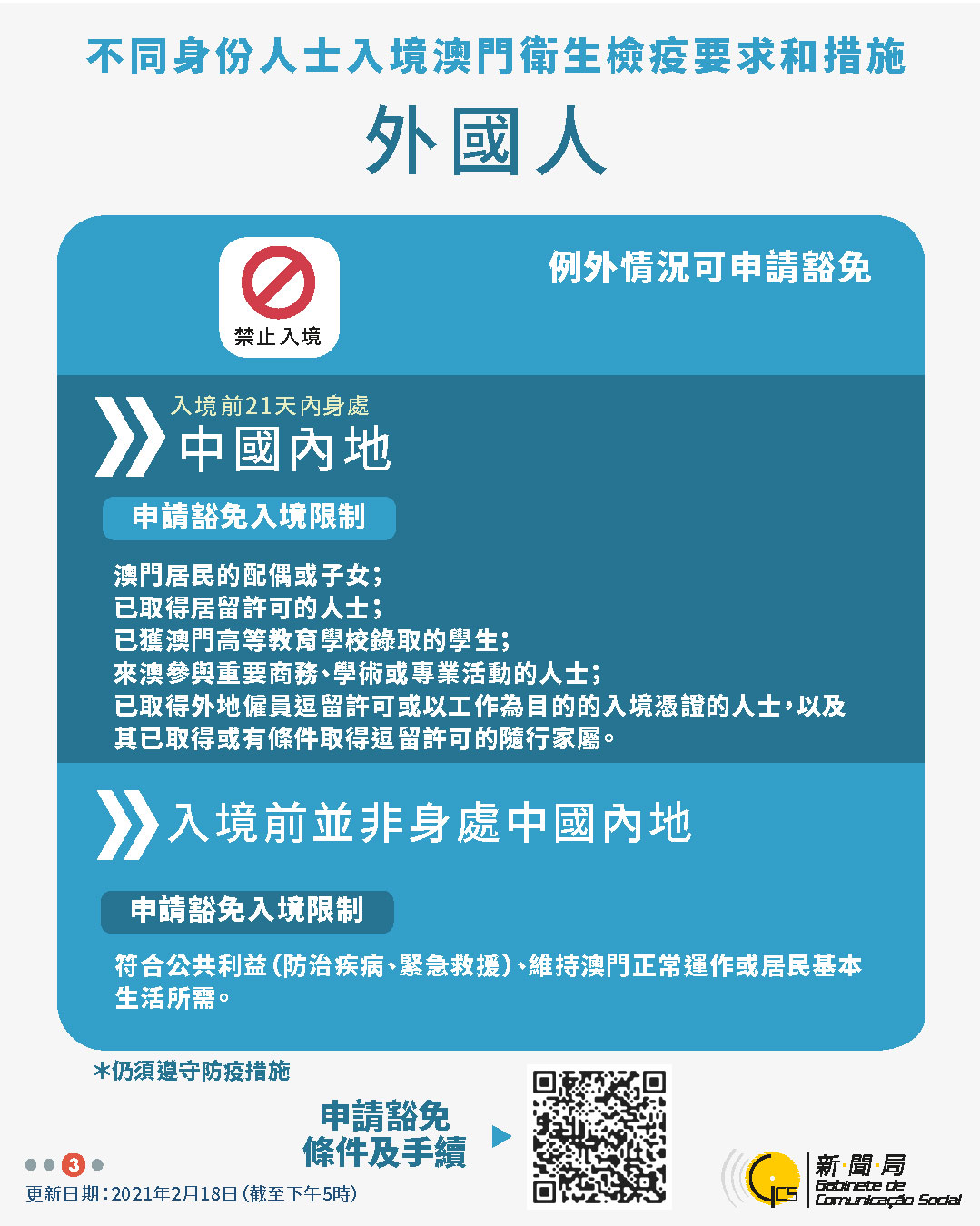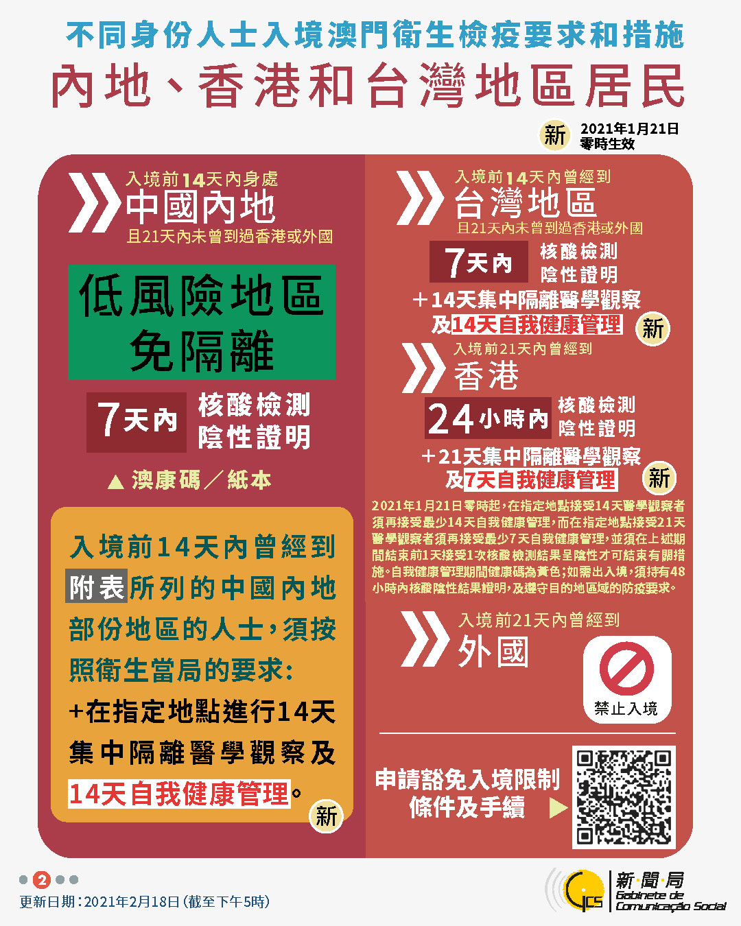 【圖文包】2021/02/18最新入境澳門衛生檢疫要求和措施