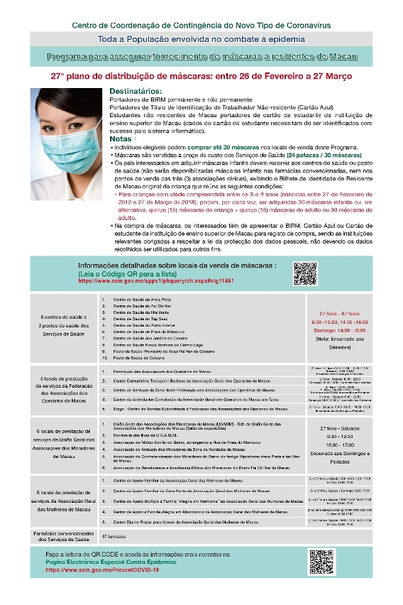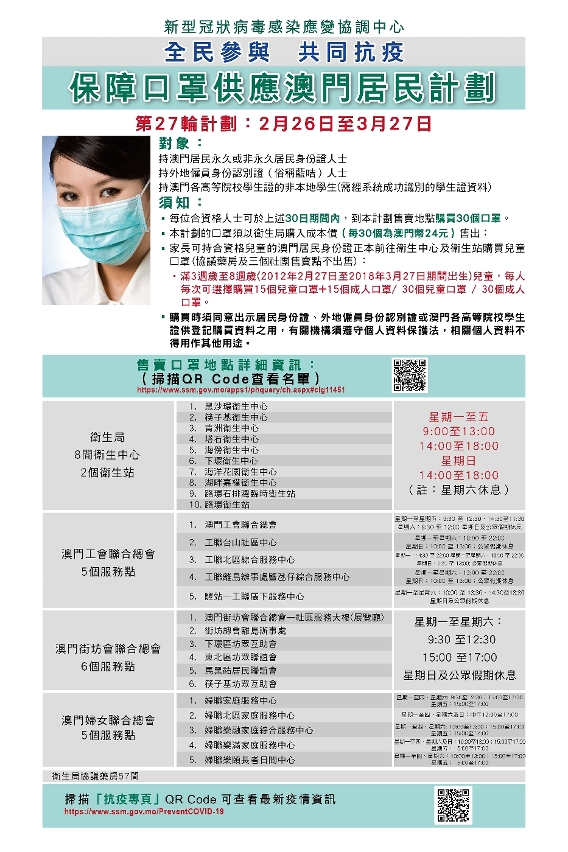新型冠狀病毒感染應變協調中心今(22)日公佈,第27輪保障口罩供應澳門居民計劃於週五(26日)開始,售賣期間為30日,即2021年2月26日至3月27日,期間每人可一次性購買30個口罩,售價合共24澳門元。對象包括本澳永久及非永久居民、持外地僱員身份認別證(俗稱藍咭)人士,以及持澳門各高等院校學生證的非本地學生,學生在購買口罩時須出示所就讀高等院校的學生證,經系統成功識別學生證資料後方能購買。