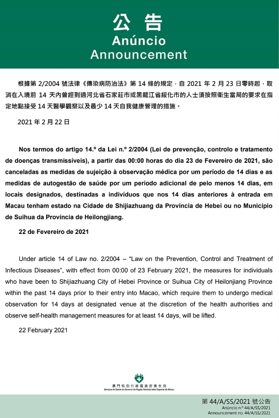 新型冠狀病毒感染應變協調中心宣佈,因應河北省、黑龍江省的疫情變化,根據第2/2004號法律《傳染病防治法》第14條的規定,自2021年2月23日零時起,取消在入境前14天內曾經到過河北省石家莊市全市、黑龍江省綏化市的人士須按照衛生當局的要求在指定地點接受14天醫學觀察以及最少14天自我健康管理的措施。