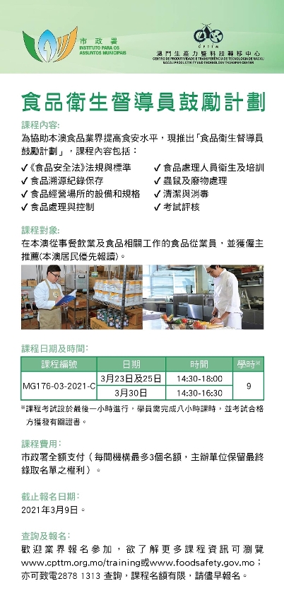為協助本澳食品業界做好食品安全管理工作,市政署委託澳門生產力暨科技轉移中心定期開辦專為業界而設的食品安全培訓課程。三月份「食品衛生督導員課程」將於三月二十三日起在澳門生產力暨科技轉移中心舉行,報名日期由即日起至三月九日,歡迎業界踴躍報讀。