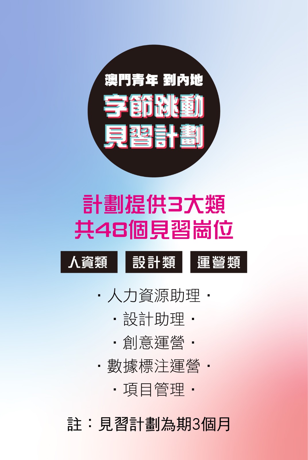 為支持青年到內地拓展就業空間,勞工局與內地著名企業北京字節跳動科技有限公司(下稱“字節跳動”)合作推出“澳門青年到內地字節跳動見習計劃”(下稱計劃)。計劃由2021年2月9日至2021年2月28日接受報名,參加對象須為澳門居民且於2019年或2020年取得高等教育學位,並具備應徵崗位所需的技能。勞工局希望有興趣的青年把握機會報名參加。