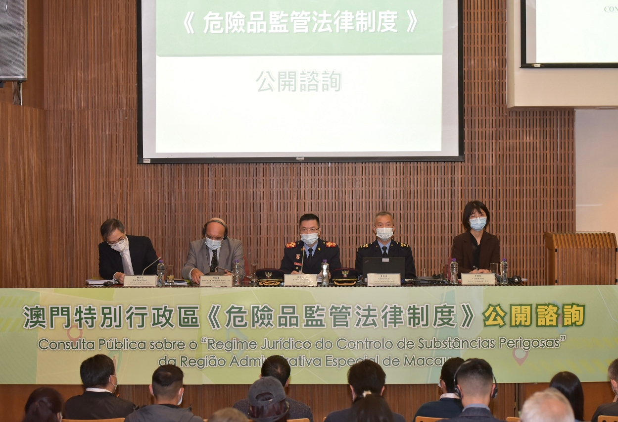 澳門特別行政區政府就制定《危險品監管法律制度》,由2021年1月23日至3月8日,展開為期45天的公開諮詢,繼早前完成了三場業界諮詢會後,再分別於2月5日、20日及27日在水坑尾公共行政大樓地庫演講廳舉行了三場公眾諮詢會,合共逾170名市民出席,其中有33名市民發表了意見及建議。