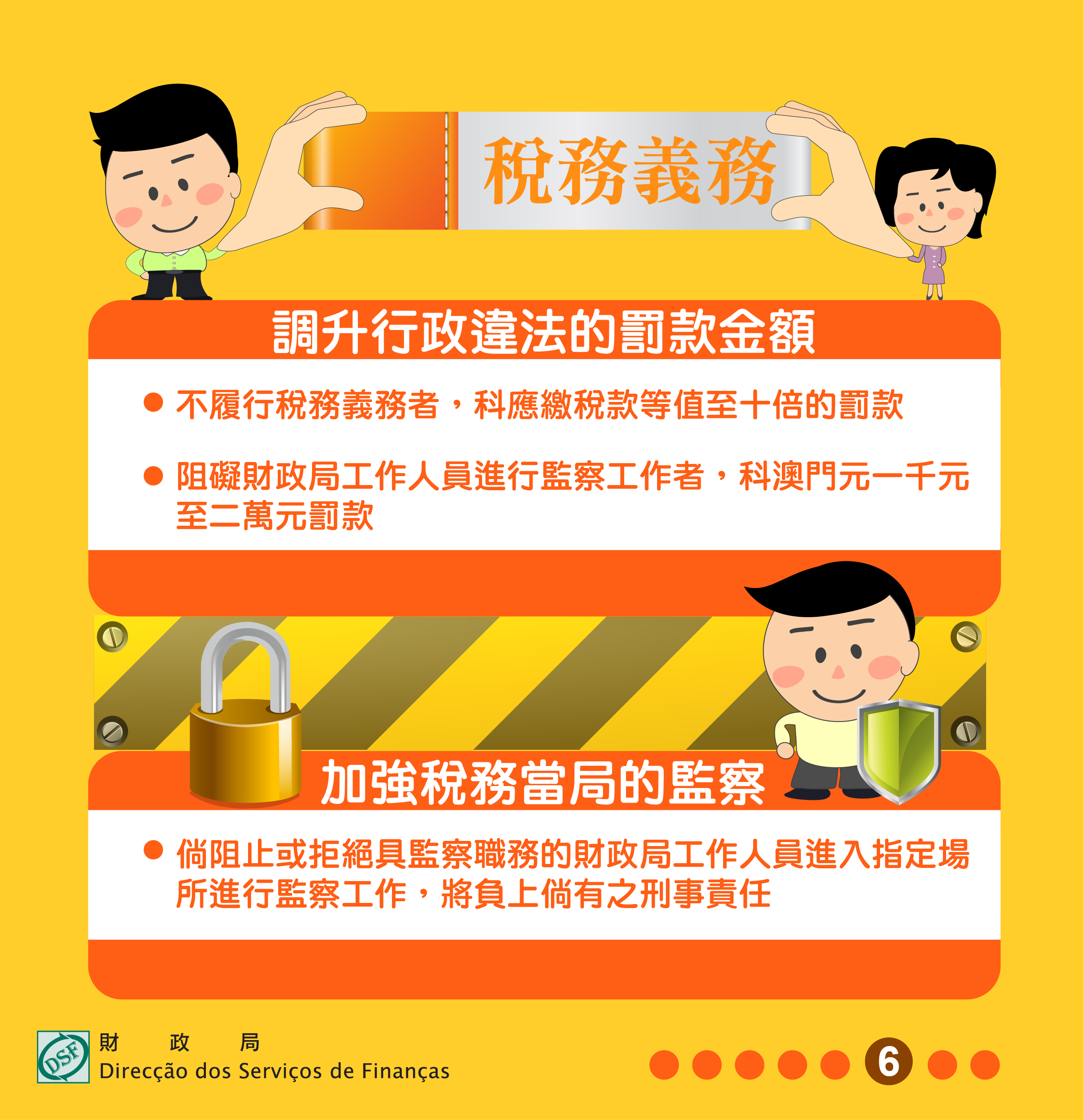 同時,該法律將調升行政違法的罰款金額,增加納稅人不履行稅務義務的違法成本,以打擊和減少逃漏稅的違法行為。亦將適當加強稅務當局的監察,倘阻止或拒絕具監察職務的財政局工作人員進入指定場所進行監察工作,將負上倘有之刑事責任。