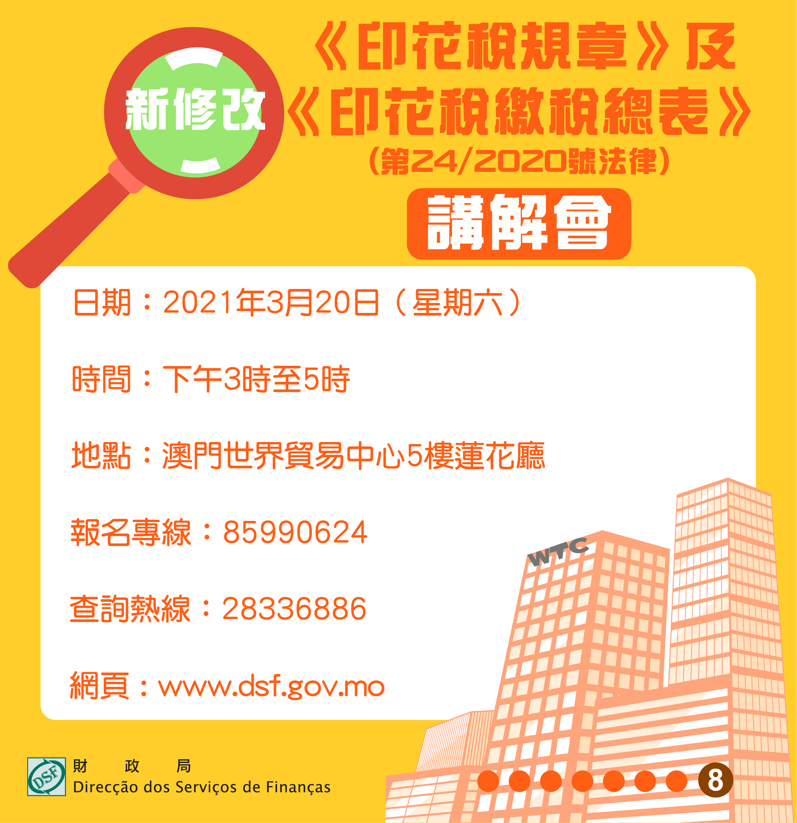 為讓公眾及相關業界更了解新修改的內容,財政局將於2021年3月20日(星期六)下午3時至5時於澳門世界貿易中心5樓蓮花廳舉辦“新修改《〈印花稅規章〉及〈印花稅繳稅總表〉》講解會”,主要介紹新修改的內容和過渡規定等,並設答問環節。屆時會以廣東話進行,並設即場葡文傳譯,歡迎公眾報名出席,名額有限,先到先得,報名請致電85990624。