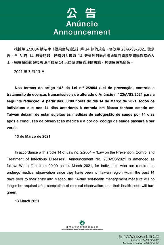 新型冠狀病毒感染應變協調中心宣佈,因應台灣地區的疫情變化,根據第2/2004號法律《傳染病防治法》第14條的規定,修改第23/A/SS/2021號公告,自2021年3月14日零時起,所有因入境前14天曾經到過台灣地區而須接受醫學觀察的人士,完成醫學觀察後毋須再接受14天自我健康管理的措施,其健康碼為綠色。該項措施亦適用於因同一原因已入境澳門正在進行醫學觀察及已完成醫學觀察的人士。已完成醫學觀察的人士其健康碼由黃色自動變為綠色。