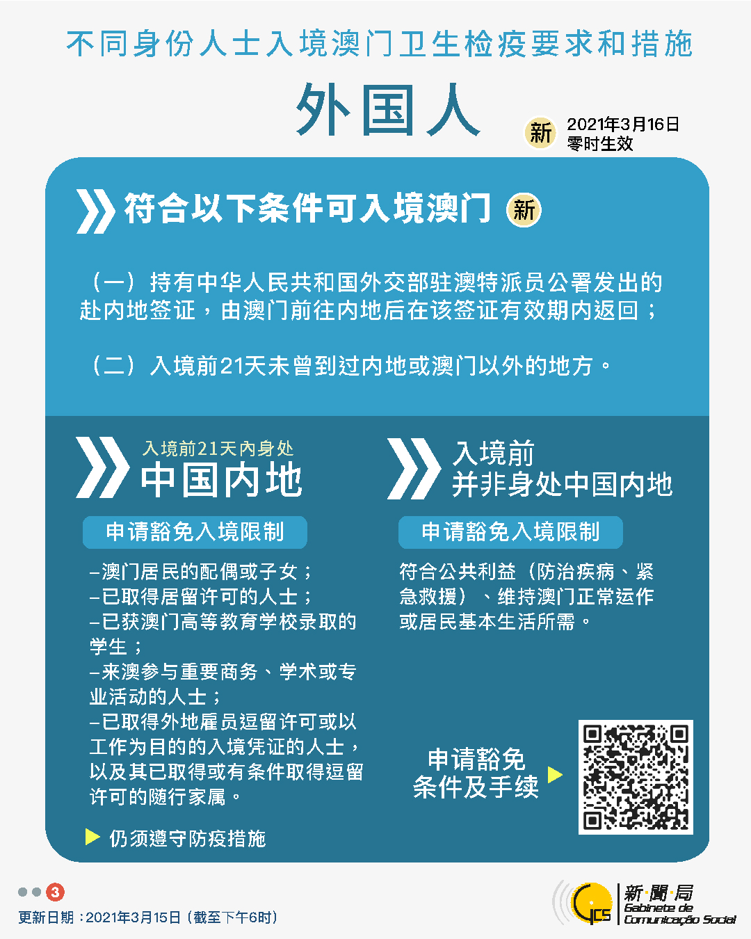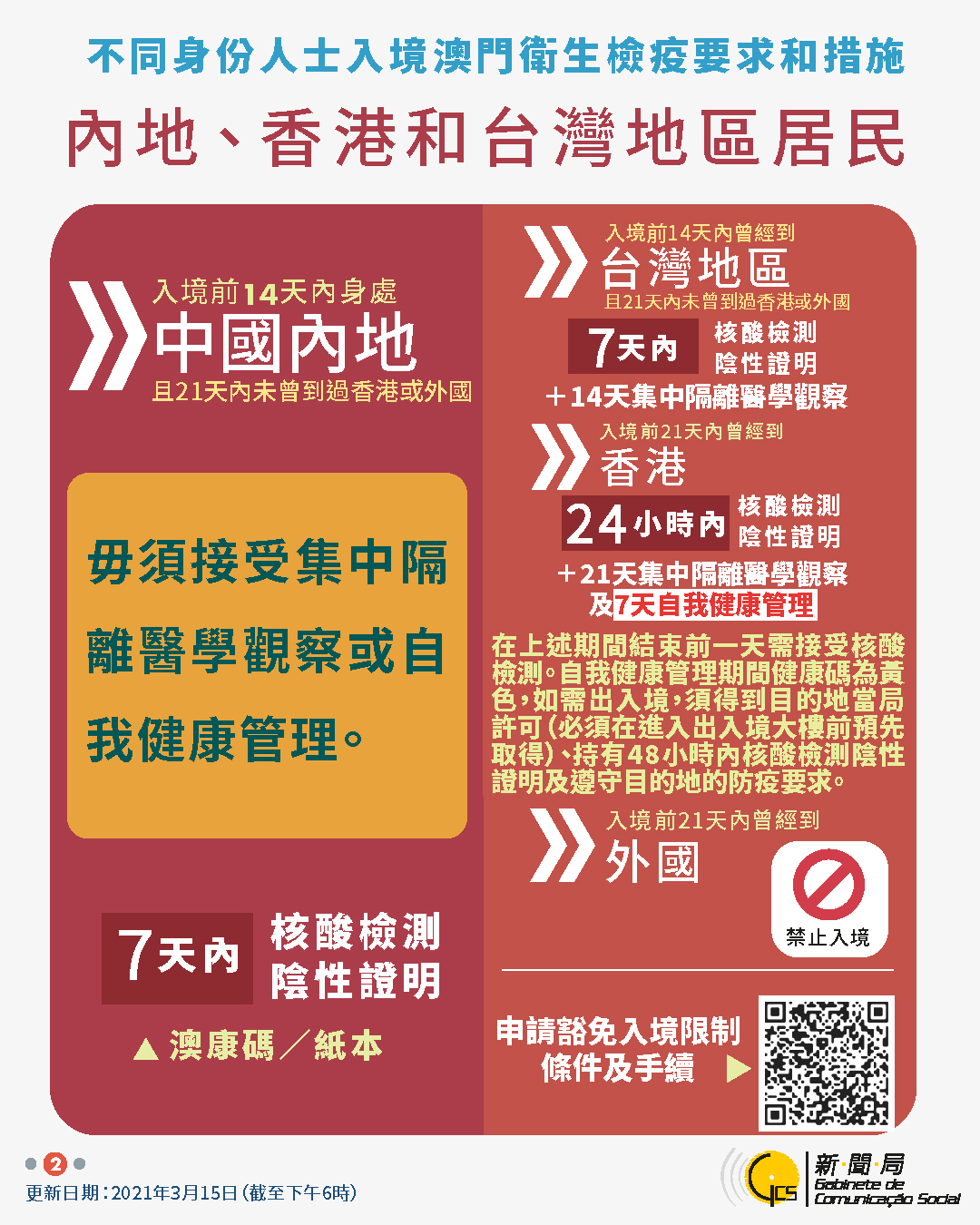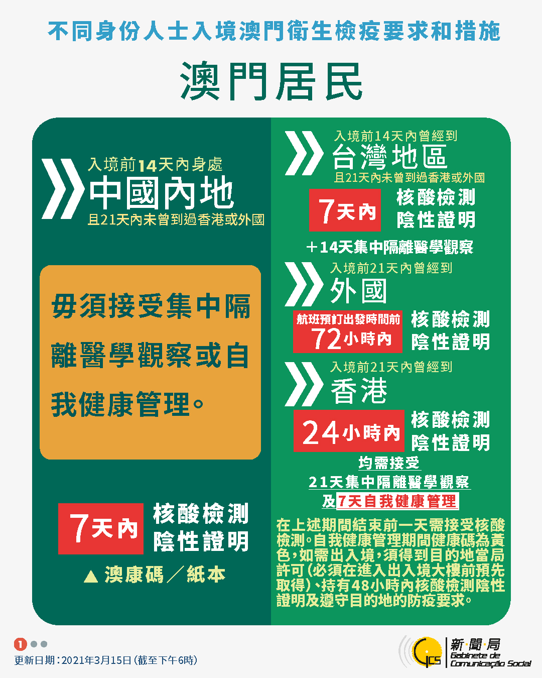 【圖文包】2021/03/15最新入境澳門衛生檢疫要求和措施
