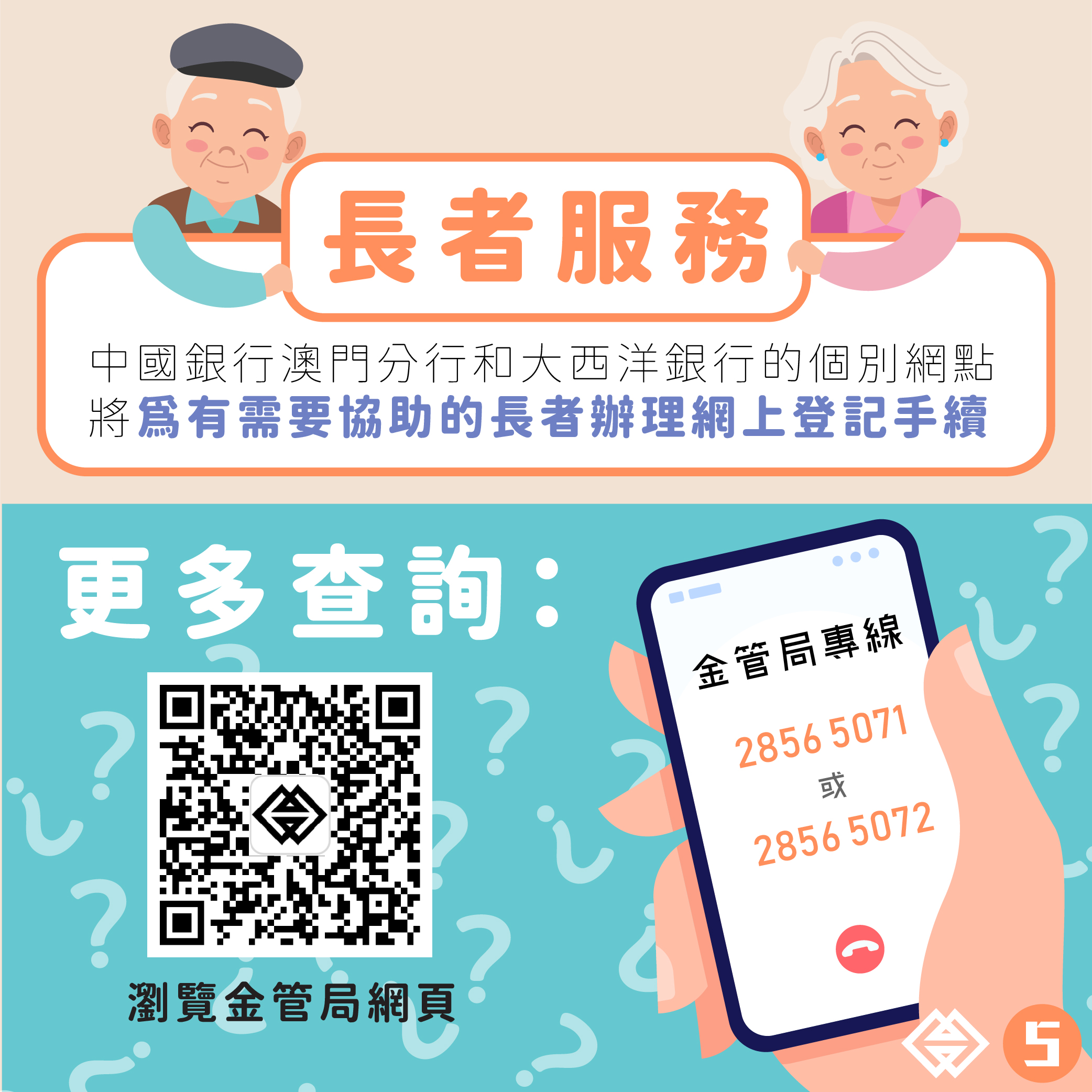 中國銀行澳門分行和大西洋銀行的個別網點,將為有需要協助的長者辦理網上登記手續。倘有任何查詢,可致電金管局專線(電話:2856 5071 / 2856 5072),或瀏覽金管局網頁:https://www.amcm.gov.mo/static/banknotes/terms_zh.html。
