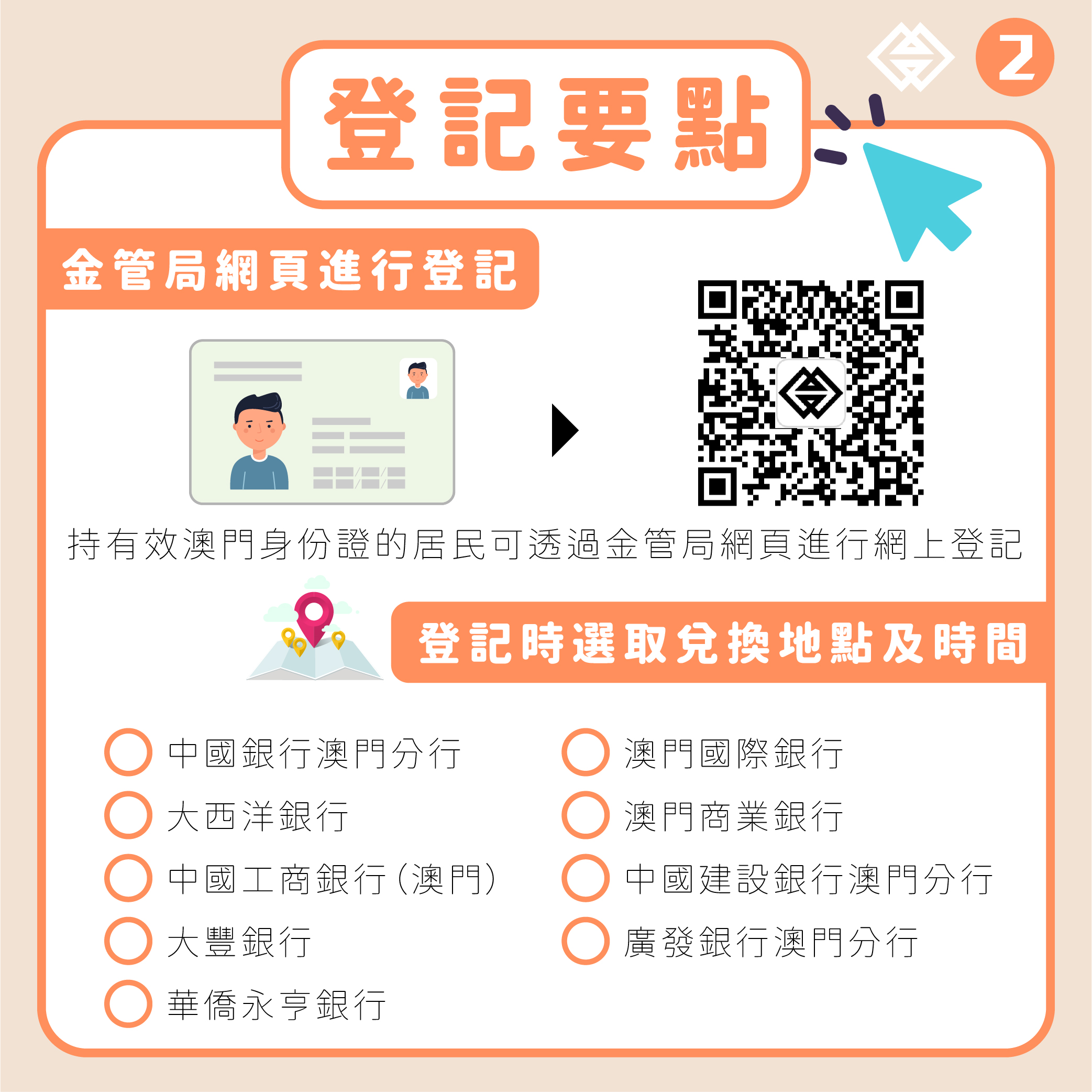 除中國銀行澳門分行及大西洋銀行這兩家發鈔銀行外,居民於登記時可選取的兌換地點,還包括中國工商銀行(澳門)、大豐銀行、華僑永亨銀行、澳門國際銀行、澳門商業銀行、中國建設銀行澳門分行及廣發銀行澳門分行的指定網點。成功登記人士應保留相關登記確認記錄,也可以通過網上登記系統查詢登記確認資料。