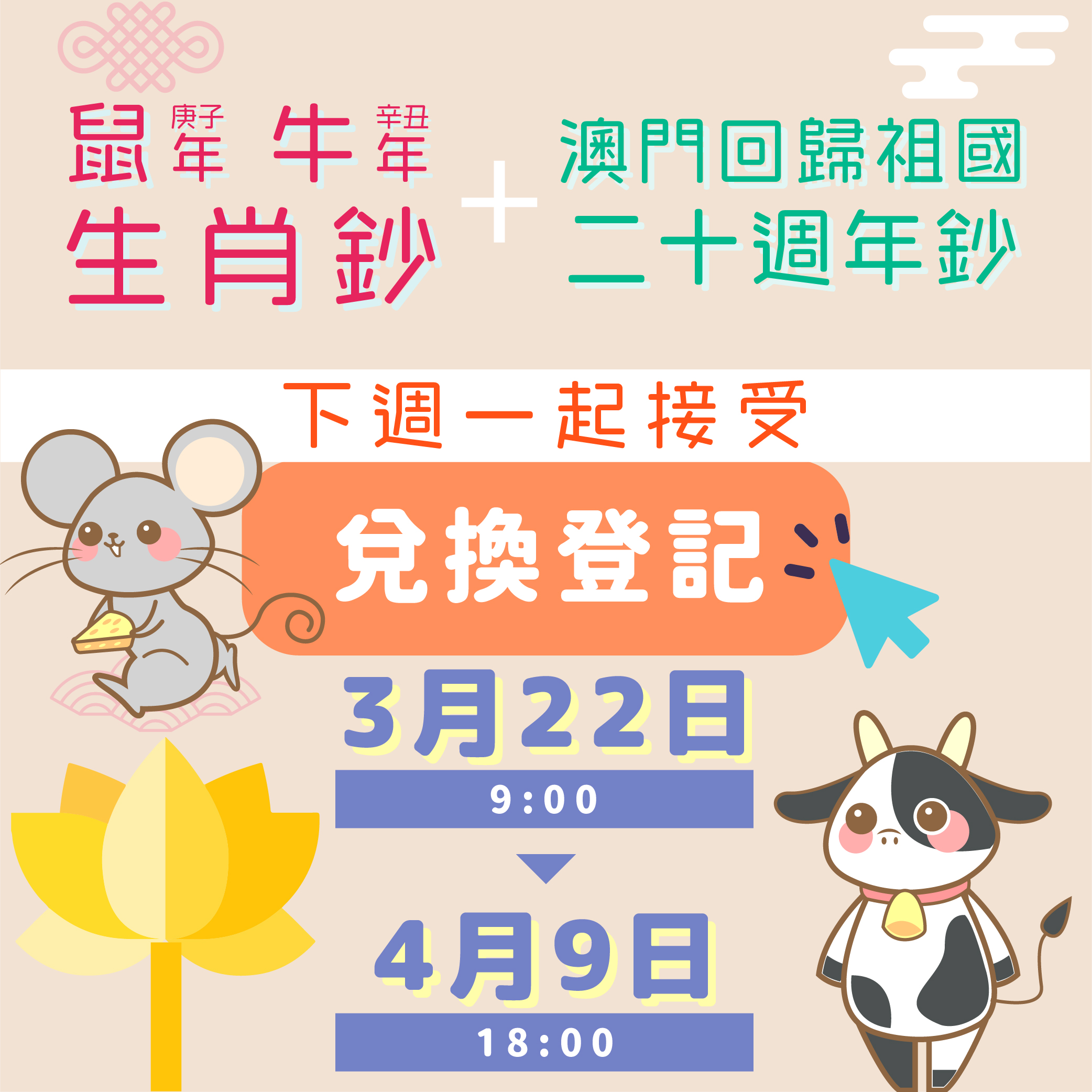 兩家發鈔銀行所發行的庚子鼠年及辛丑牛年生肖鈔,連同早前已發行的澳門回歸祖國二十週年鈔,將合併讓澳門居民登記兌換。網上登記期由下週一(3月22日)起。
