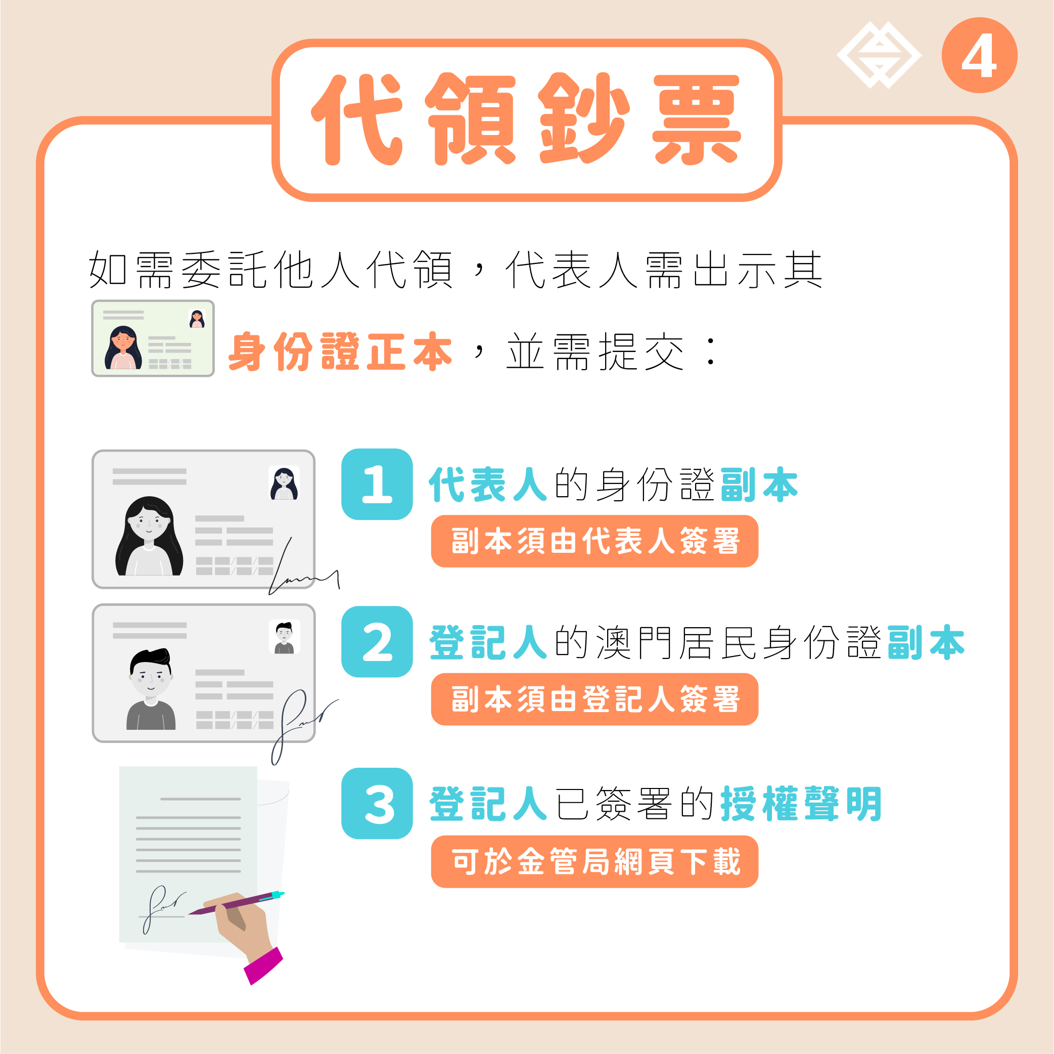 兌換期為2021年5月4日至7月23日,成功登記的人士請於所選定的時間及銀行網點,帶同其有效的澳門居民身份證親身前往兌換。如需委託他人代領,代表人則須帶同自己的身份證明文件正本以及提交下列文件: