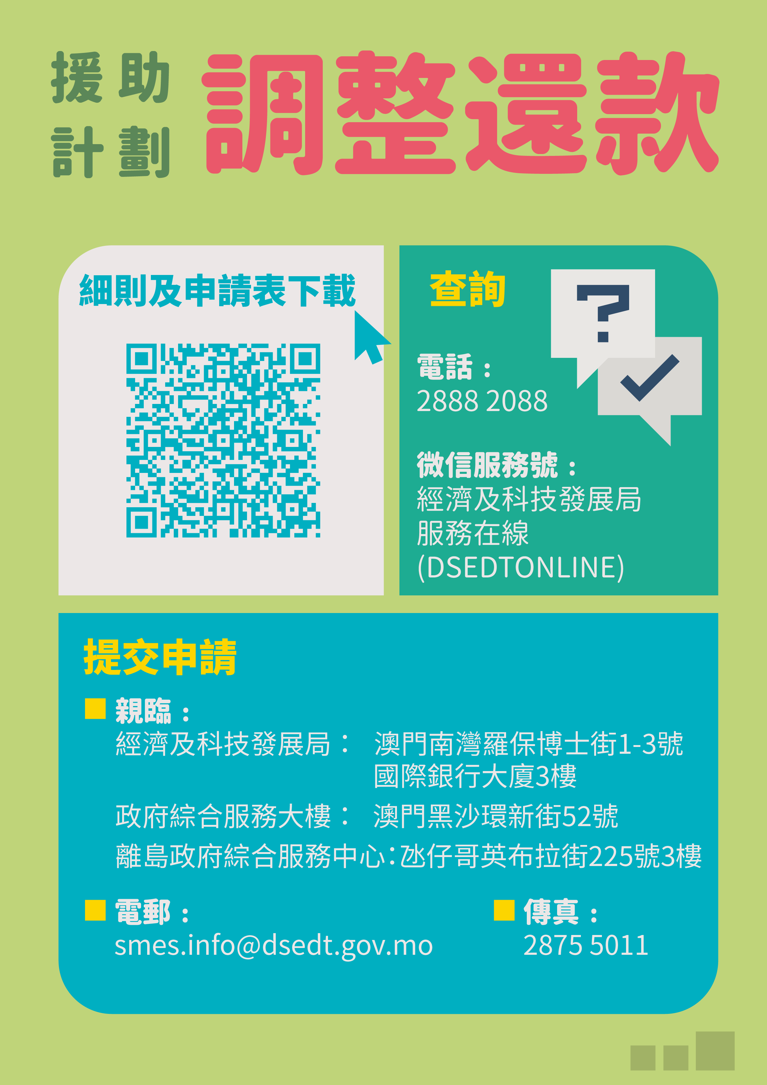 有需要申請調整援助還款的企業,可於經科局網頁下載並填妥專用申請表格,遞交至經科局各服務櫃台,或可透過傳真(2875 5011)或電郵(smes.info@dsedt.gov.mo)方式提交。