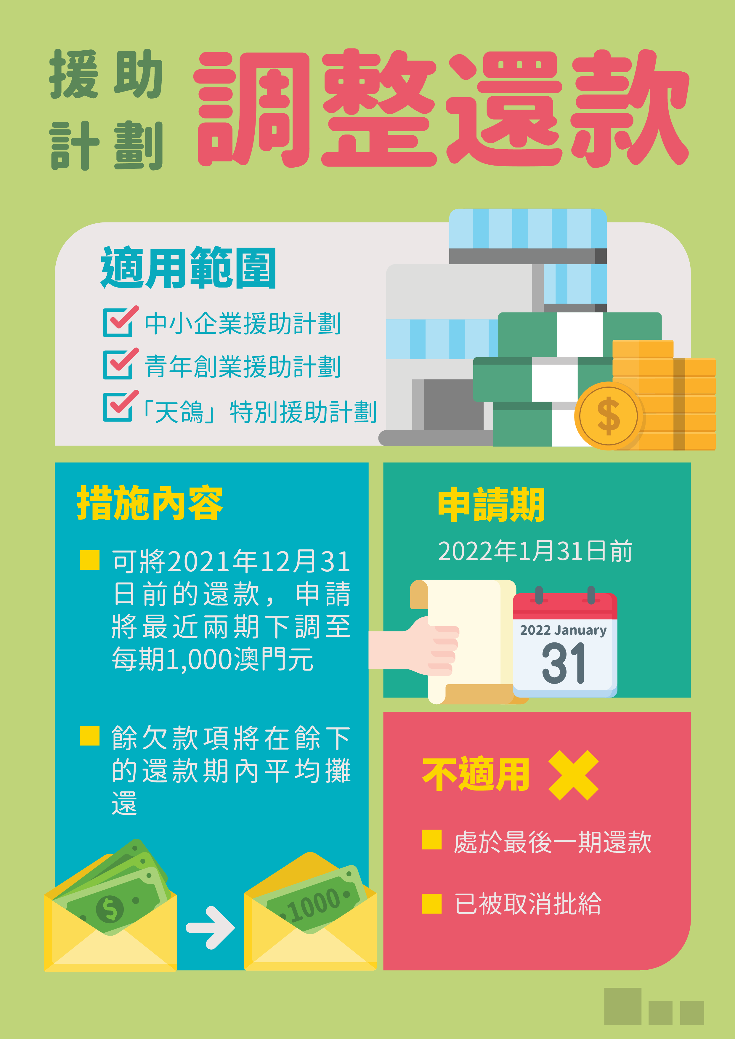 有關措施適用於調整2021年12月31日前的還款,曾於2020年獲批調整還款的企業可以再度提出申請。為便民便商,企業更可申請同時調整兩期還款。但倘處於最後一期還款,或已被取消援助批給的企業,則不適用於有關措施。