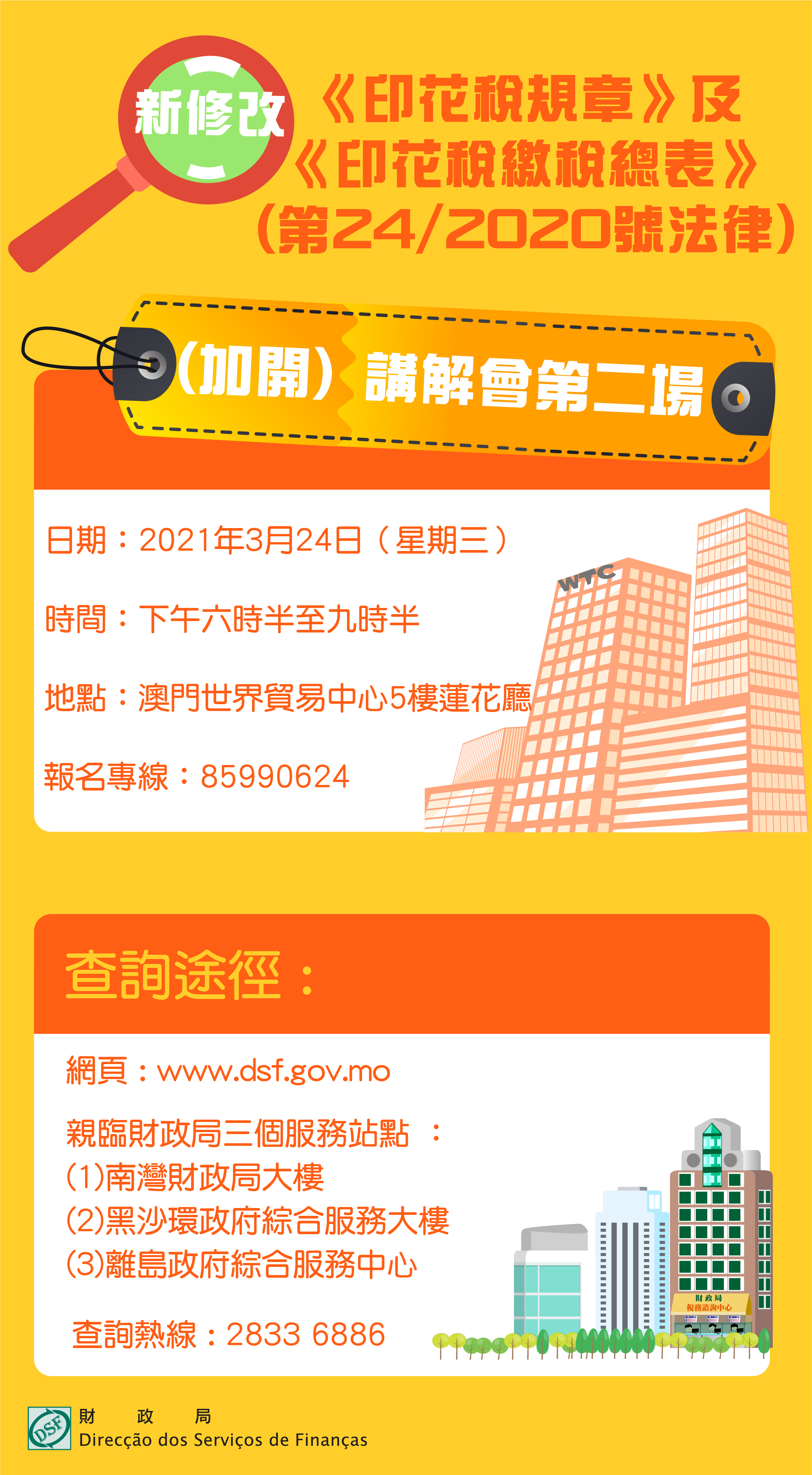 第24/2020號法律《修改〈印花稅規章〉及〈印花稅繳稅總表〉》將於2021年3月31日生效,為讓社會大眾及相關業界人士認識新修改的內容和過渡規定,除原訂於3月20日(星期六)下午三時至五時假澳門世界貿易中心5樓蓮花廳舉辦的專場講解會外,因應報名踴躍,將於3月24日(星期三)下午六時半至九時半再於同一地點加開一場。講解會以廣東話進行,並設即場葡文傳譯,設答問環節。歡迎公眾報名出席,名額有限,先到先得,報名請致電85990624。