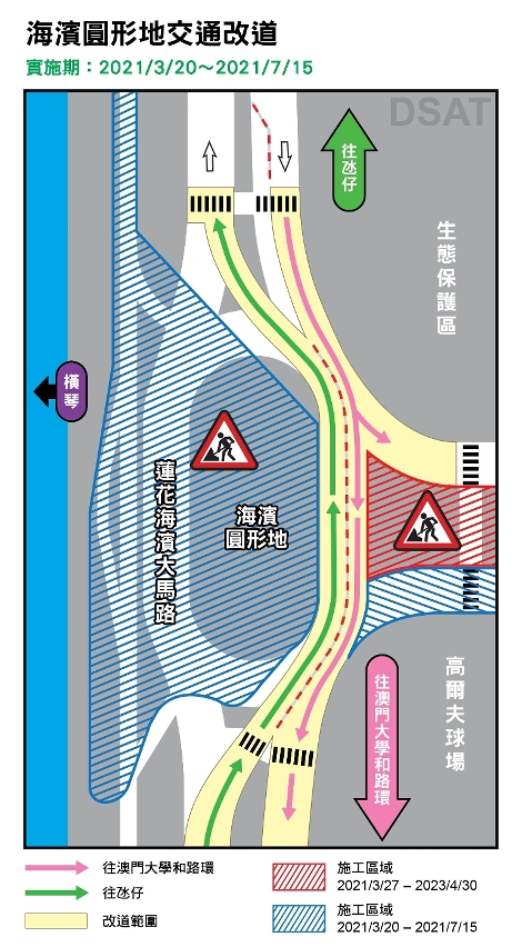 配合建設發展辦公室開展澳門輕軌延伸橫琴線項目,由2021年3月20日(周六)起,相關道路將分階段實施臨時交通安排,其中靠單車徑一側的海濱圓形地由3月20日至7月15日封閉交通,靠蓮花路一則的海濱圓形地改為雙向行車;蓮花路停車場與海濱圓形地之間的一段蓮花路,即往海濱圓形地方向也實施封閉交通,車輛不能經由蓮花路左轉入澳大河底隧道,只能經蓮花海濱大馬路進入。