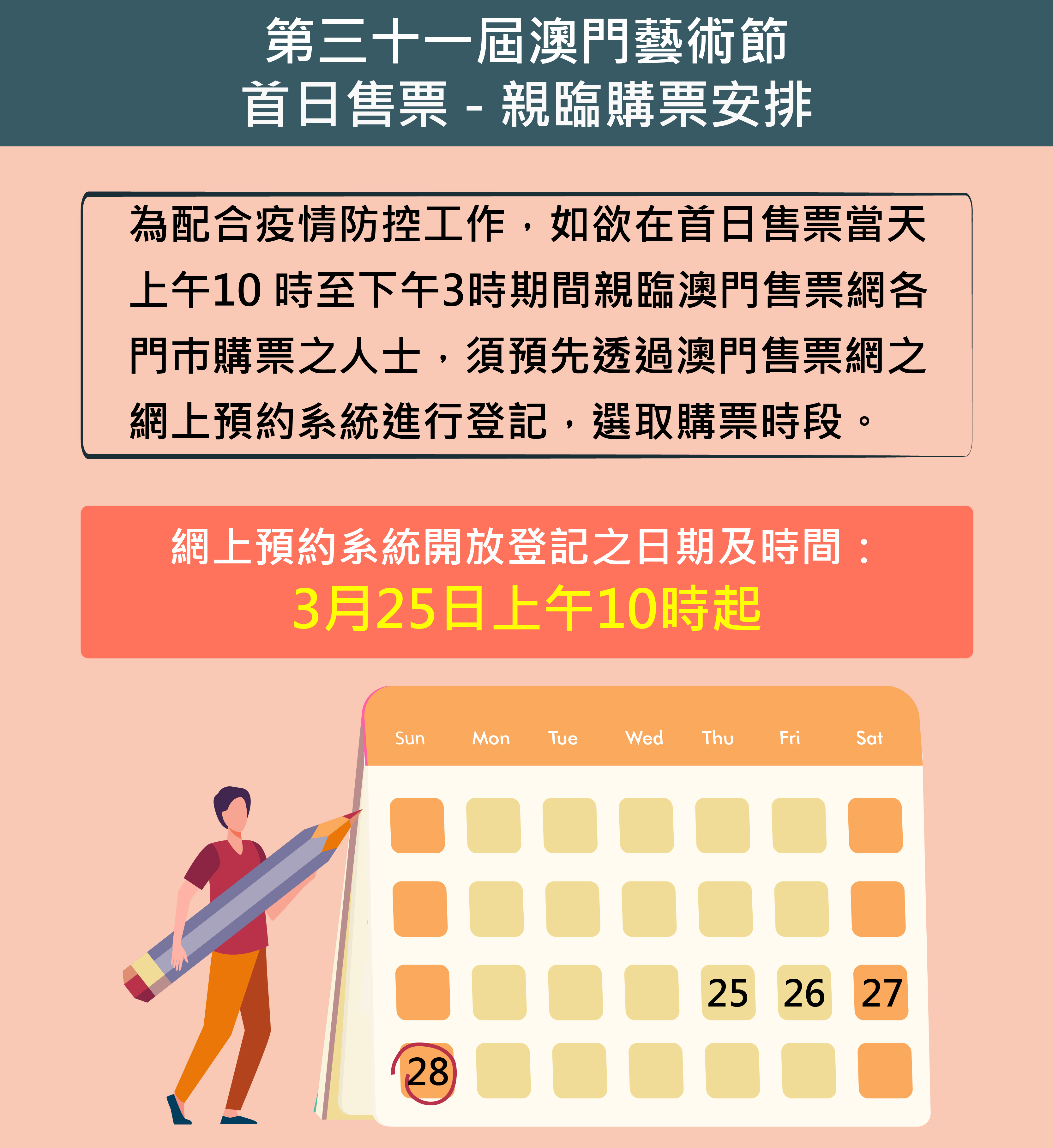 由文化局主辦的第三十一屆澳門藝術節將於5月隆重舉行,門票3月28日(星期日)上午10時於澳門售票網公開發售。為做好疫情防控工作,保障市民的健康,首日售票當日上午10時起,門市購票、電話及網上訂票服務將同步開通,而為減少購票現場輪候人流聚集,特設首日售票網上預約系統,市民於3月25日(星期四)上午10時起可透過網上預約系統進行登記。