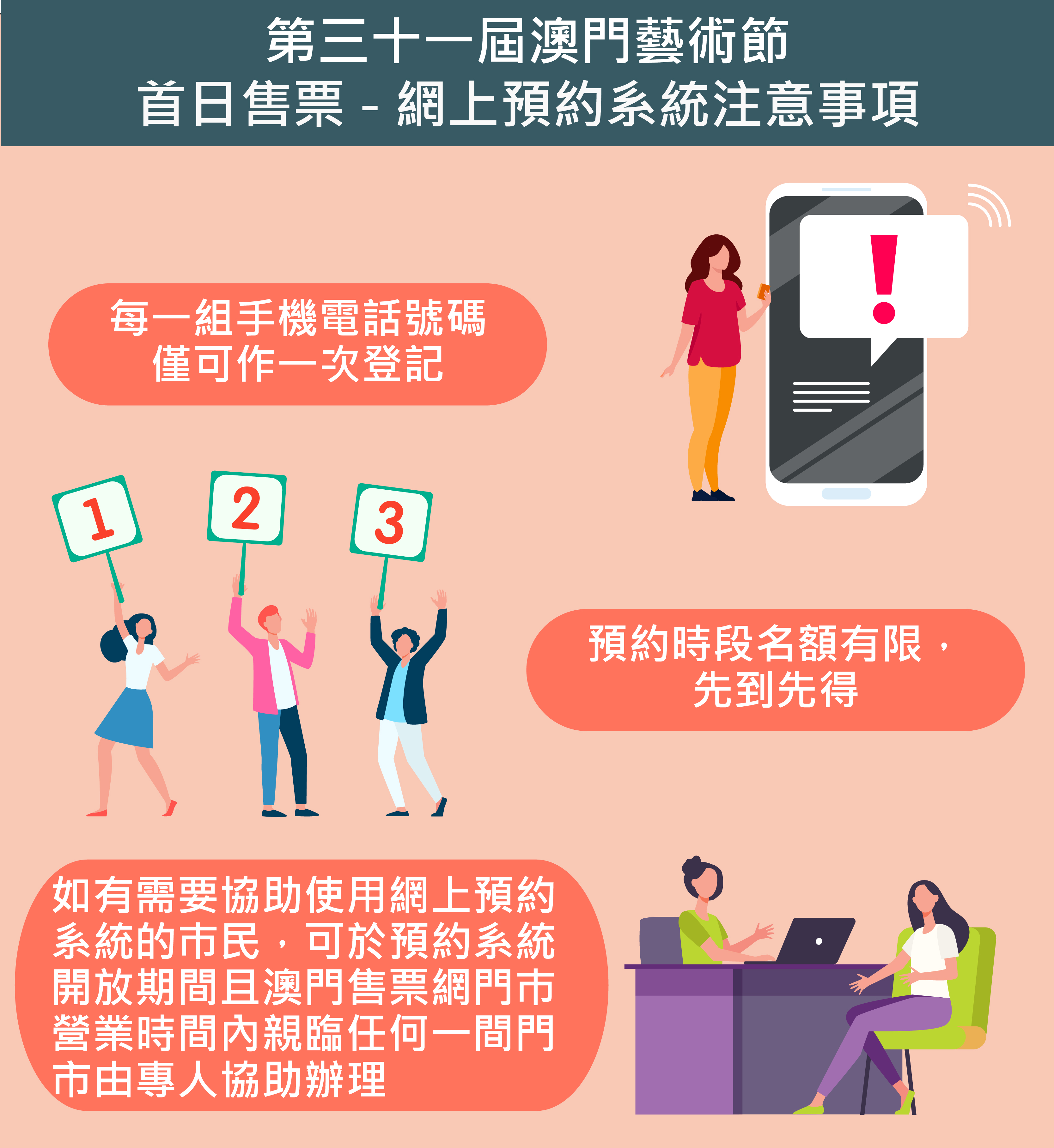 為優化澳門藝術節購票安排,為觀眾帶來省時便捷的購票服務,主辦單位今年同步開通現場及電子多元購票模式,特設首日售票網上預約系統,系統於3月25日(星期四)上午10時起開通,選擇在首日售票當日上午10時至下午3時親臨澳門售票網門市購票之觀眾,透過系統憑手機電話號碼預約購票時段,成功預約者便可按時段前往自選門市購票。有需要協助使用網上預約系統的市民,亦可於預約系統開放期間且澳門售票網門巿營業時間內親臨任何一間澳門售票網門市由專人協助辦理。預約時段名額有限,先到先得,每一組手機電話號碼僅可作一次登記。而選擇電話及網上訂票的市民毋須預先進行登記。