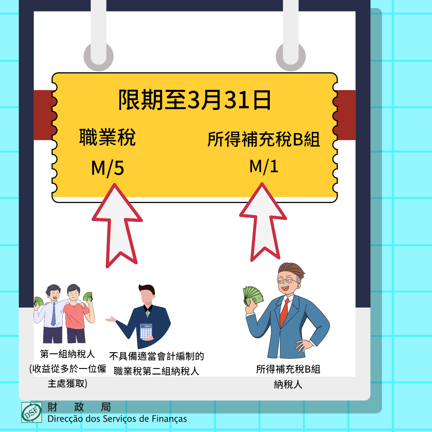 財政局呼籲,所得補充稅B組納稅人必須透過所得補充稅M/1收益申報書,申報其上年度從事工商業活動所取得的收益,而2020年度收益申報書的遞交期限為2021年3月31日;另外,收益從多於一位僱主處獲取的職業稅第一組納稅人,以及不具備適當編製會計的職業稅第二組納稅人,根據第25/2021號經濟財政司司長批示,2020年度職業稅M/5式收益申報書的遞交期限,延長至2021年3月31日。
