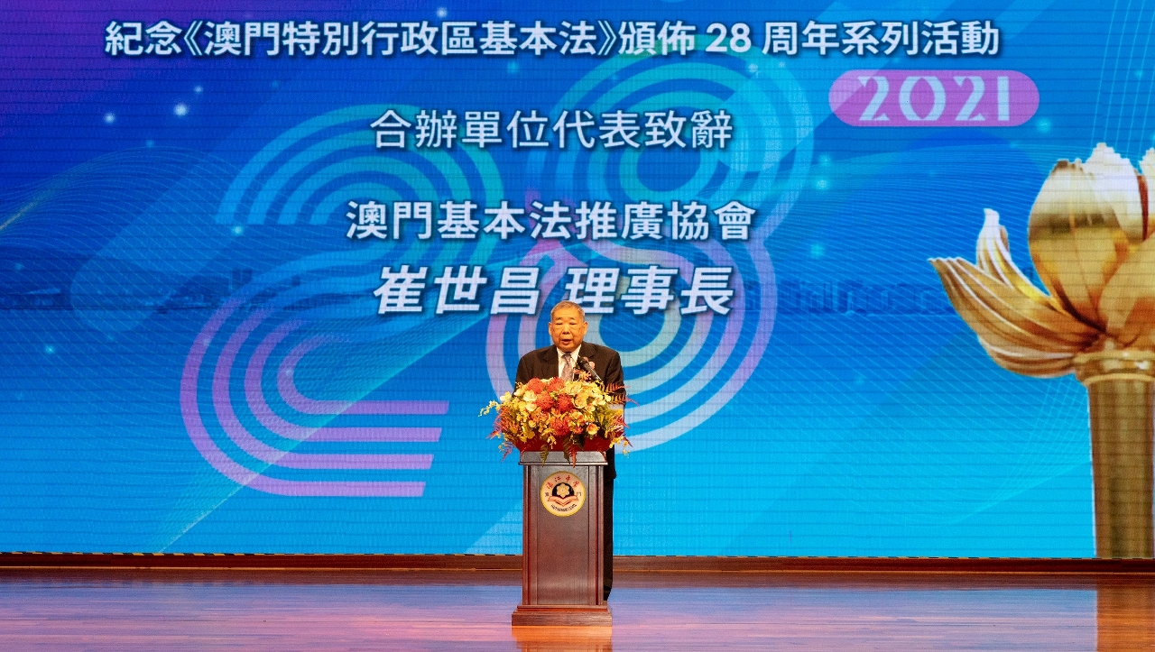 崔世昌理事長在代表合辦機構致辭時表示,《憲法》與《澳門基本法》是推進澳門加快融入國家發展大局的法律保障,是“一國兩制”的基石。多年來合辦機構都結合紀念基本法頒佈周年的契機,結合形勢發展與社會現實需要,持續深入摸索宣傳推廣基本法的模式,取得了有目共睹的成績。他強調,宣傳推廣《憲法》和《澳門基本法》要圍繞國家當前新發展階段、新發展理念、新發展格局這三個“新”方位做工作,幫助廣大市民,特別是年青人更好地認識祖國,在“粵港澳大灣區”的建設中尋求發展和進步,為保持澳門長期繁榮穩定,為維護國家安全做出貢獻。
