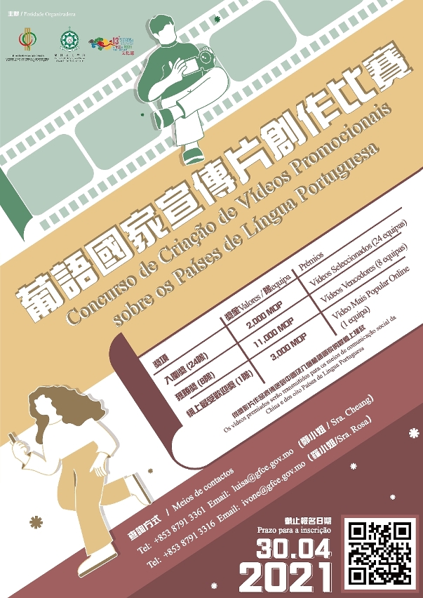 中國—葡語國家經貿合作論壇(澳門)常設秘書處將於本年10月舉辦第十三屆中國-葡語國家文化週,並藉此契機與澳門理工學院葡語教學及研究中心合辦葡語國家宣傳片創作比賽,期望以語言作為紐帶,向中國及全球推廣葡語國家的風俗歷史和傳統文化,進一步發揮澳門中葡平台作用,推進建設中葡雙語人才培養基地。比賽於3月30日至4月30日期間接受報名,歡迎合資格學生參加。