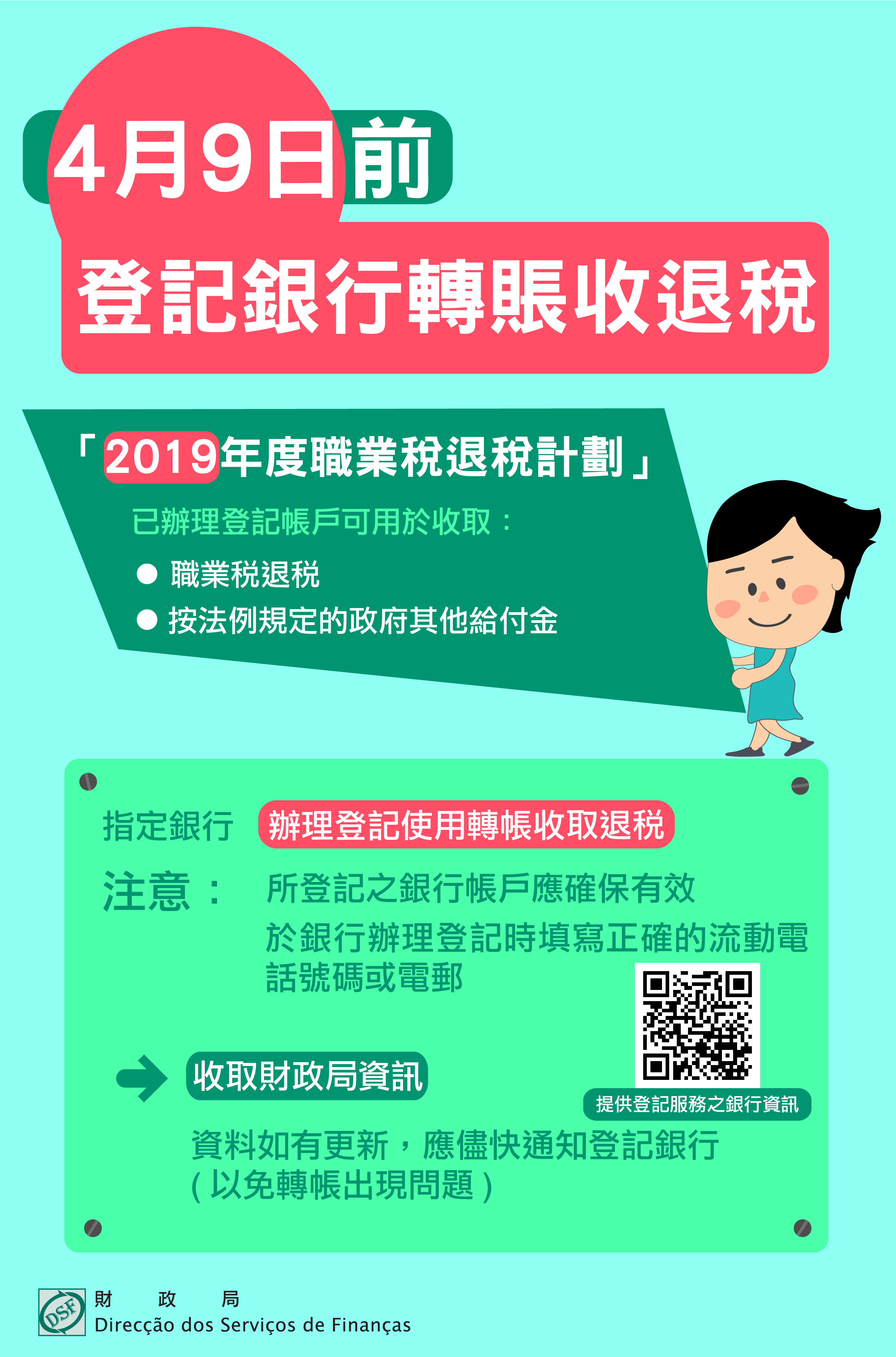 有關轉帳帳戶除可用於收取職業稅退稅外,亦可用於收取按法例規定的政府其他給付金。提供登記服務之銀行請見下表,市民亦可掃瞄二維碼或透過財政局網頁:http://www.dsf.gov.mo/tax/bankTransfer.aspx查詢銀行登記的資訊。