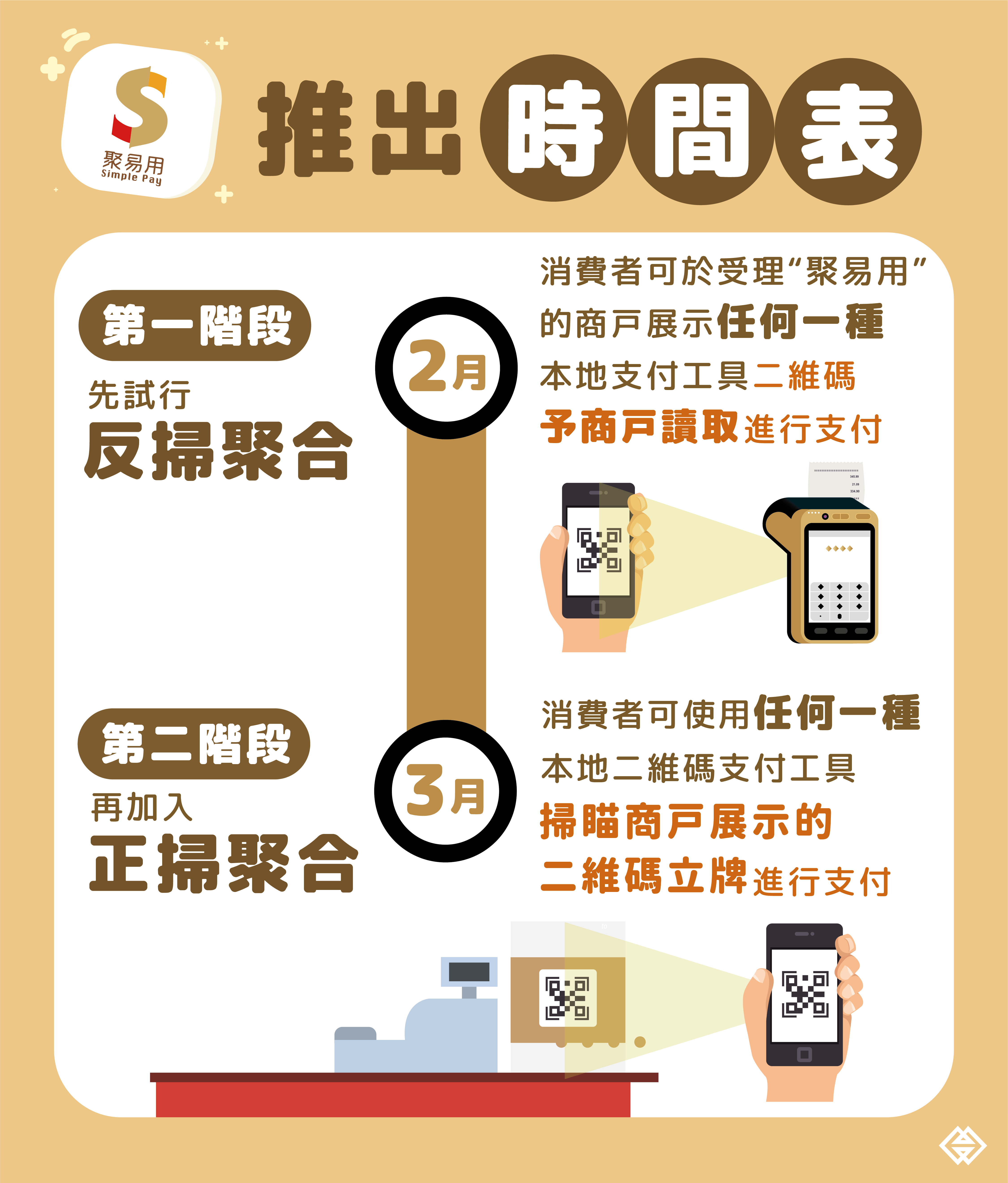 “聚易用”(Simple Pay)首階段“反掃聚合”自2月初試行順利,第二階段“正掃聚合”於今(31)日起推出試行,首天上午運作暢順。金管局已製作演示短片,讓市民及商戶更容易理解正掃交易的操作,並呼籲商戶積極升級“聚易用”。