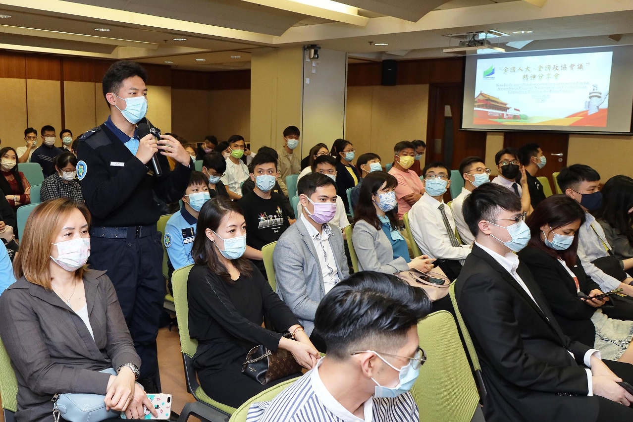 何敬麟表示,2020年是“十三五”收官之年,中國在過去一年交出一份人民滿意、世界矚目、可以載入史冊的發展報告,全年國內生產總值達101.6萬億元,比上年增長2.3%,是全球唯一實現經濟正增長的主要經濟體,並兌現“現行標準下9,899萬農村貧困人口全部脫貧”的承諾。國家“十四五”規劃提出努力爭取2060年前實現碳中和的目標,保持經濟運行在合理區間要求,配合“構建高品質發展的區域經濟佈局和國土空間支撐體系,扎實推動粵港澳大灣區建設"的要求,為大灣區未來發展指明了方向,將為澳門青年帶來發展機遇,澳門青年應堅持融入國家發展大局的初心。保持對大灣區建設的關注熱度,發揮自身獨特優勢,不怕辛苦,並保持開放和競合的心態,迎接大灣區“走進來”的良性競爭,提升自我實力和風險管理能力,不負新時代國家對澳門青年的期望與重託。在場青年積極向兩位嘉賓提出有關自身在融入大灣區、迎接未來發展所要需作的準備等問題。