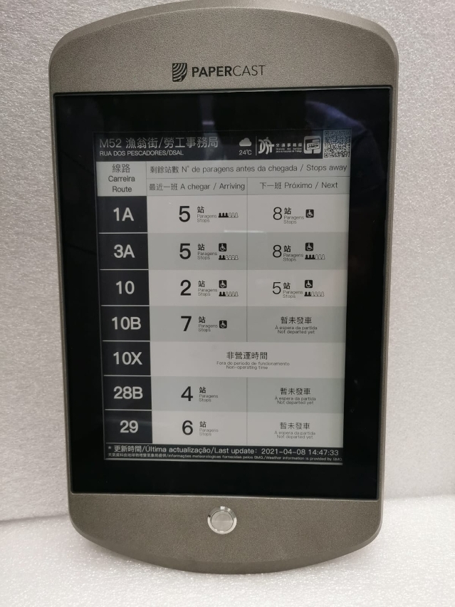 32吋太陽能彩屏電子站牌的安裝工作已有序開展,繼“亞馬喇前地”站後,局方將陸續於“和諧廣場/樂群樓”站、“約翰四世大馬路”站、“高美士/馬六甲街停車場”站、“華寶花園”站、“氹仔電訊”站進行安裝。