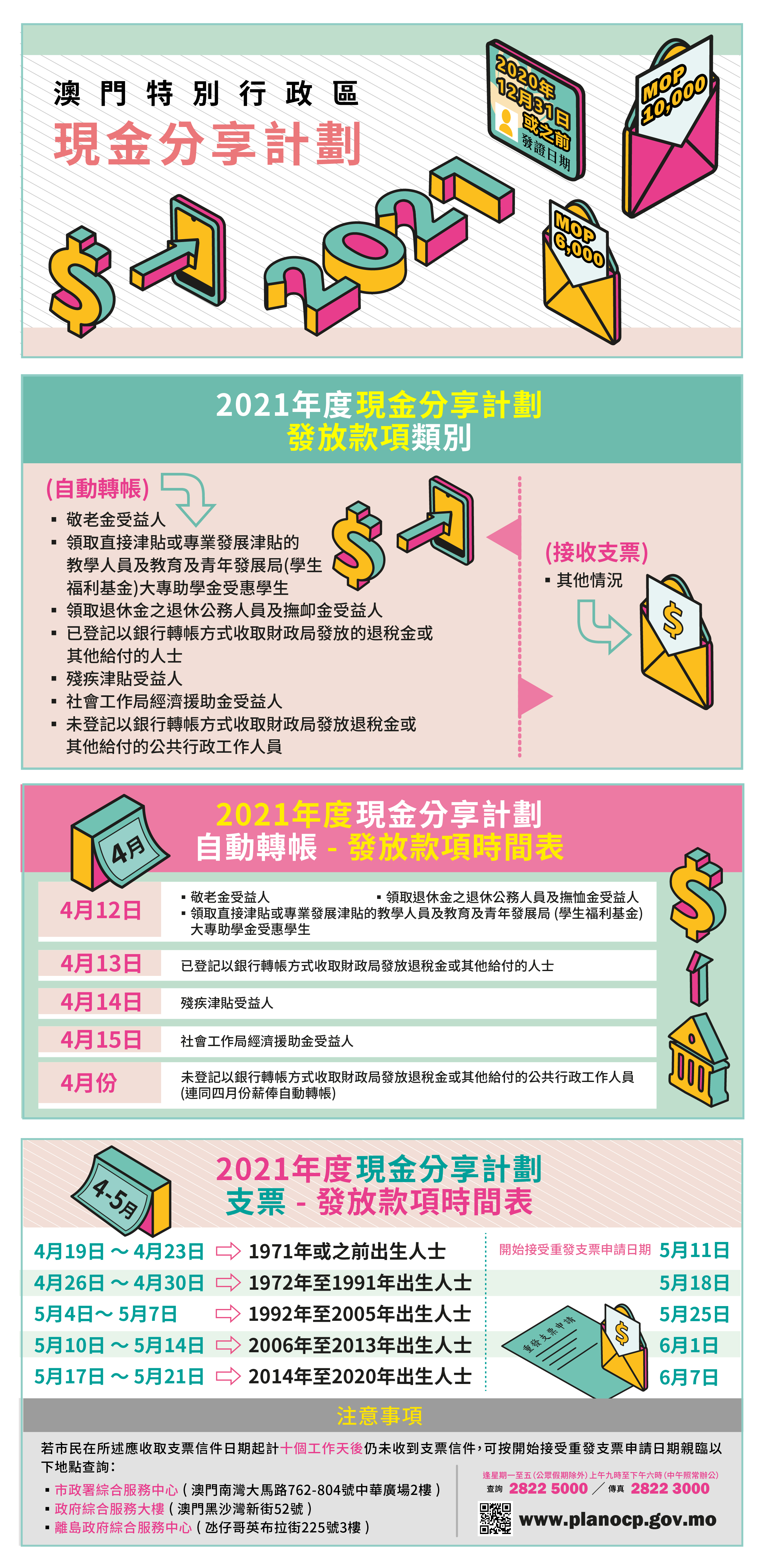 為配合計劃的執行,公眾如對本年度或過往歷年現金分享計劃有疑問或需要協助解決相關問題,可親臨南灣大馬路762-804號中華廣場2樓的市政署綜合服務中心、黑沙環新街52號政府綜合服務大樓或位於氹仔哥英布拉街225號三樓離島政府綜合服務中心的現金分享計劃櫃位、致電熱線電話2822-5000或傳真至2822-3000查詢。櫃位辦公時間:逢星期一至五(公眾假期除外)上午九時正至下午六時正,中午照常運作。同時,市民亦可透過瀏覽現金分享計劃網頁或關注財政局微信官方帳號查閱最新的發放資訊。