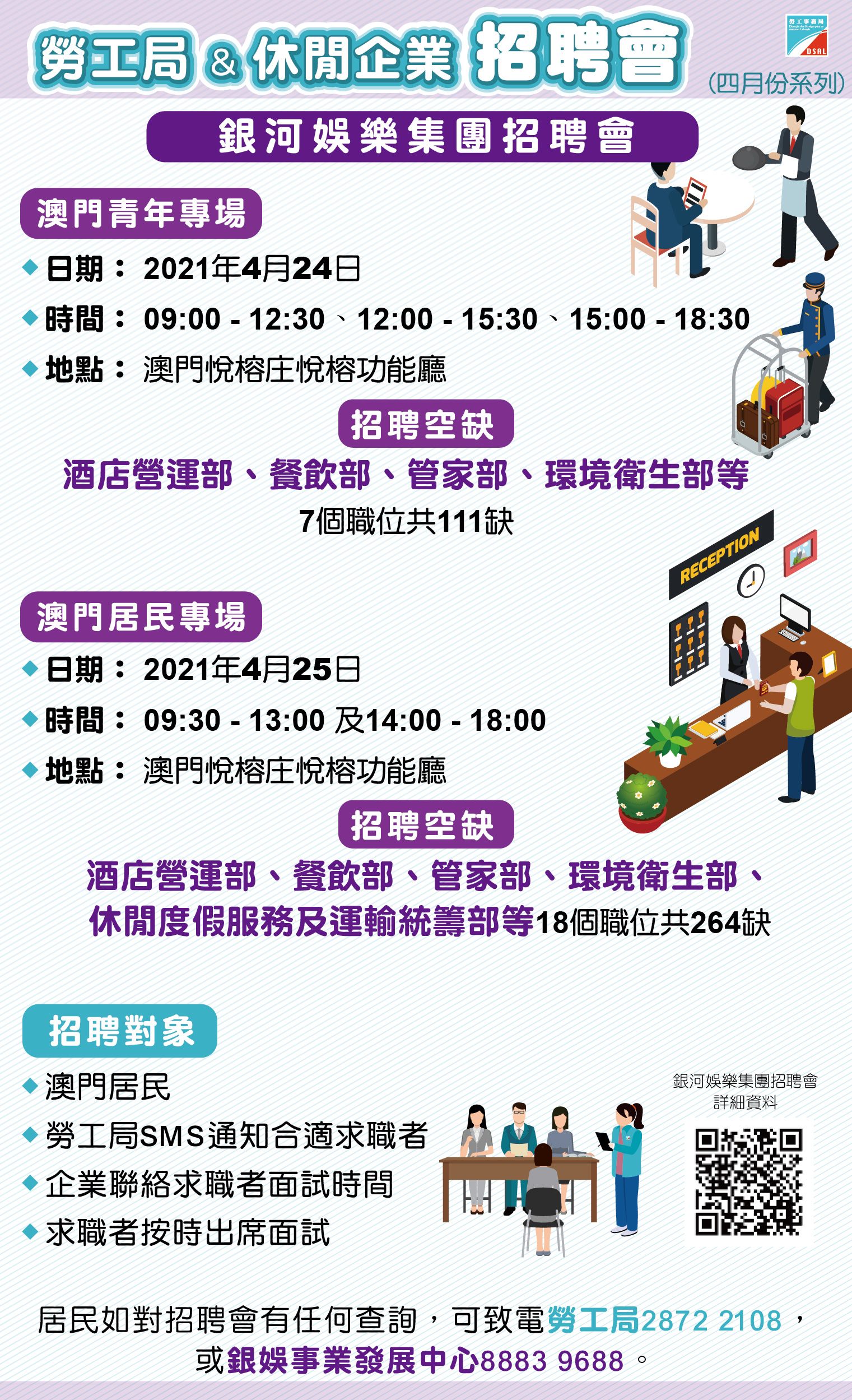 銀河娛樂集團招聘的崗位涉及酒店營運、餐飲、管家、環境衛生、休閒度假服務及運輸統籌等部門,4月24日招聘會為“澳門青年專場”,提供7個崗位,合共111個空缺,4月25日招聘會為“澳門居民專場”,提供18個崗位,合共264個空缺。招聘會場地設於悦榕庄悦榕功能廳,時間由早上9時30分至下午6時,居民如對上述兩場招聘會有任何查詢,可致電勞工局2872 2108,或銀河熱線:6368 4073 / 6368 2236。