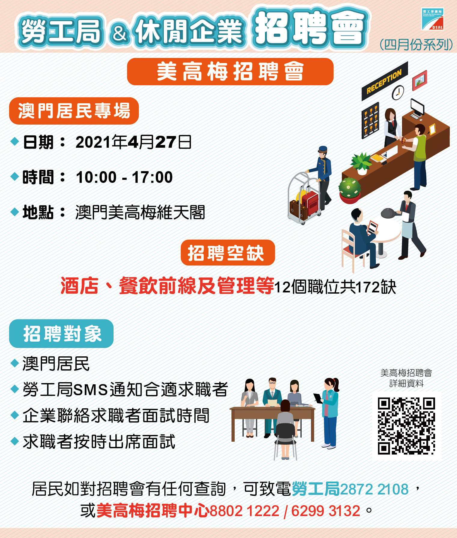 因應澳門多所休閒企業即將有新的設施投入服務,對本地人力資源有較大的需求,勞工局與三家休閒企業合作於四月內推出一系列招聘會,以促進本地居民就業。美高梅“澳門青年專場”招聘會已於4月20日舉行,另“澳門居民專場”將於4月27日舉行。合共六場招聘會約有130個崗位,接近1,000個空缺,其中較適合大專學歷人士的空缺有近350個,因崗位涉及休閒服務範疇,大部分需輪班工作。繼與美高梅合作後,勞工局於本月23日以後,將陸續與銀河娛樂集團及“澳門主題公園渡假村”分別合作舉辦4場招聘會,招聘對象為澳門居民,由勞工局轉介,聯絡面試由企業安排,勞工局會派員駐場監察。