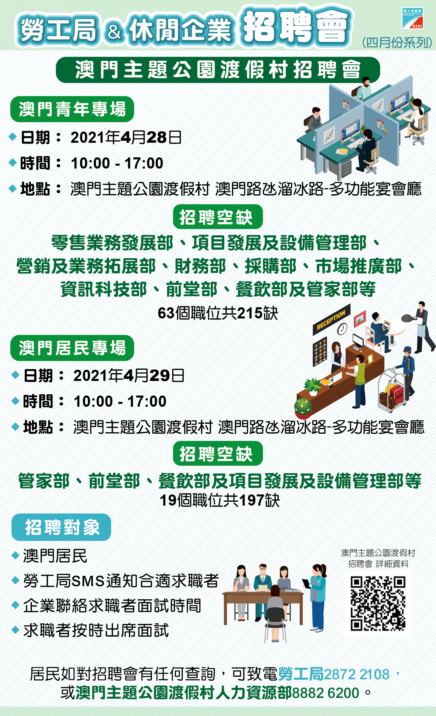 “澳門主題公園渡假村”招聘的崗位涉及零售業務發展、項目發展及設備管理、營銷及業務拓展、市場推廣、資訊科技、餐飲及管家等部門,4月28日招聘會為“澳門青年專場”,提供63個崗位,合共215個空缺,4月29日招聘會為“澳門居民專場”,提供19個崗位,合共197個空缺。招聘會場地設於澳門路氹溜冰路澳門主題公園渡假村2樓多功能宴會廳,時間由早上10時至下午5時,居民如對上述兩場招聘會有任何查詢,可致電勞工局2872 2108,或“澳門主題公園渡假村”人力資源部8882 6200。