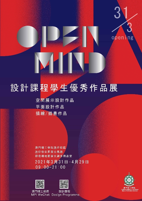 設計課程學生優秀作品展現正對外開放,地點為澳門理工學院氹仔校區研發樓地面層文創多用途室,展期至2021年4月29日,歡迎有興趣人士參觀欣賞,詳情可致電88936939查詢。