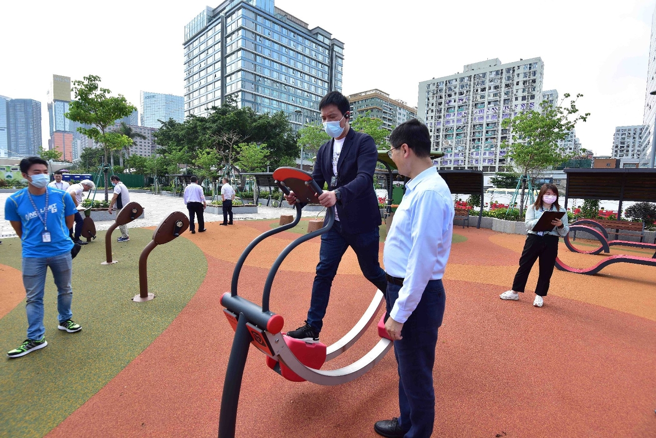 市政管理委員會主席戴祖義、副主席羅志堅,委員關施敏、麥儉明,陪同市政諮詢委員會主席司徒民義及多名委員視察現場設施。觀音像海濱休憩區總面積約一點五萬平方米,當中兒童遊樂區佔約二千七百平方米,引入了新穎的遊樂設施,並劃分不同年齡區域,讓小朋友在玩樂中學習不同技巧及鍛鍊體能,有助身心平衡發展。休憩區內亦設有約四百米的海濱步行徑、多功能球場、門球場、滾軸溜冰場等健身康樂設施,為市民大眾及青少年提供多元的休閒運動選擇。另外,亦設有儲物櫃、自助售賣服務區等,而茶座、親子廁所及哺乳室等友善設施亦將會陸續進場,讓不同年齡層的市民在海濱休憩區玩樂時,有更好的使用感受。