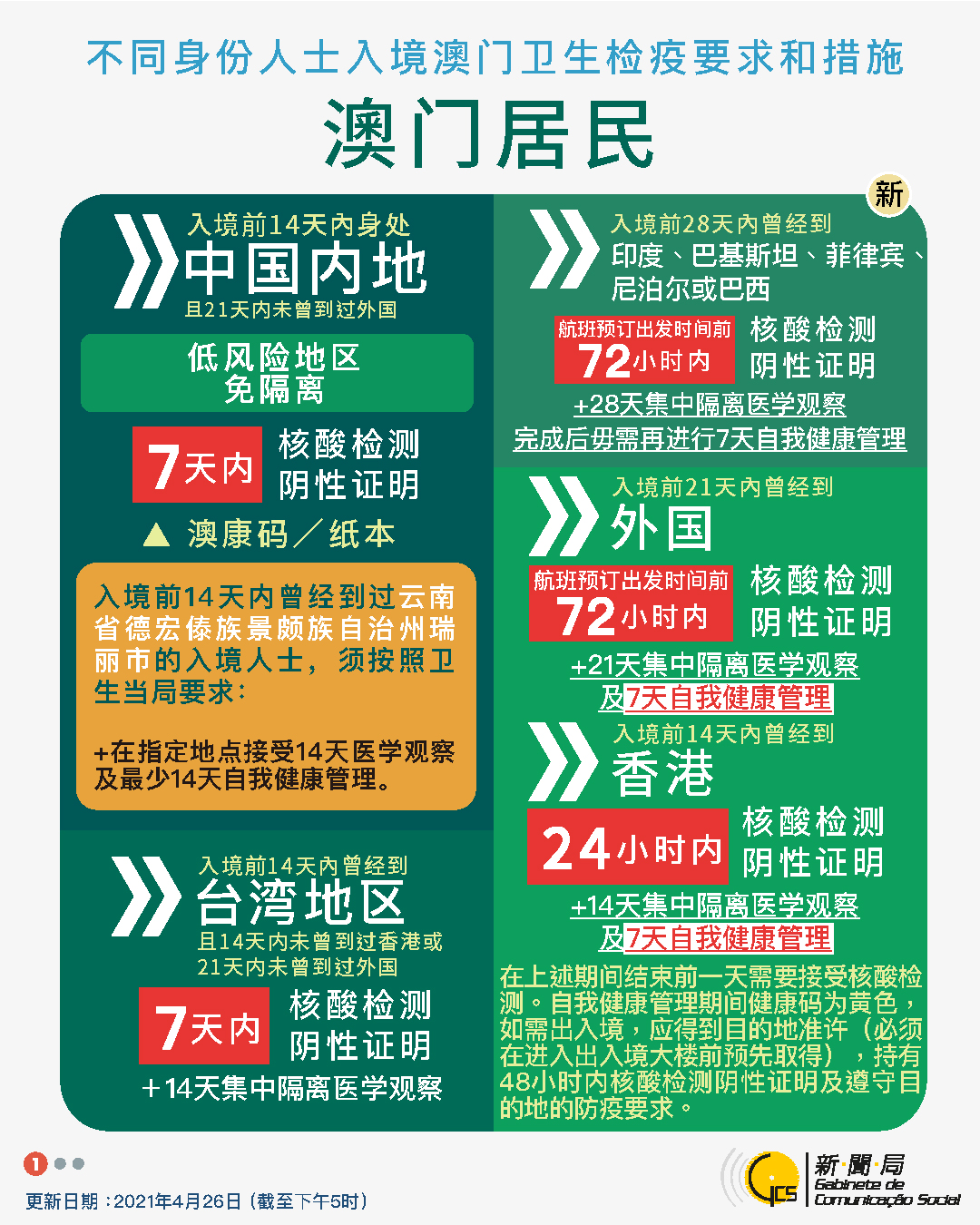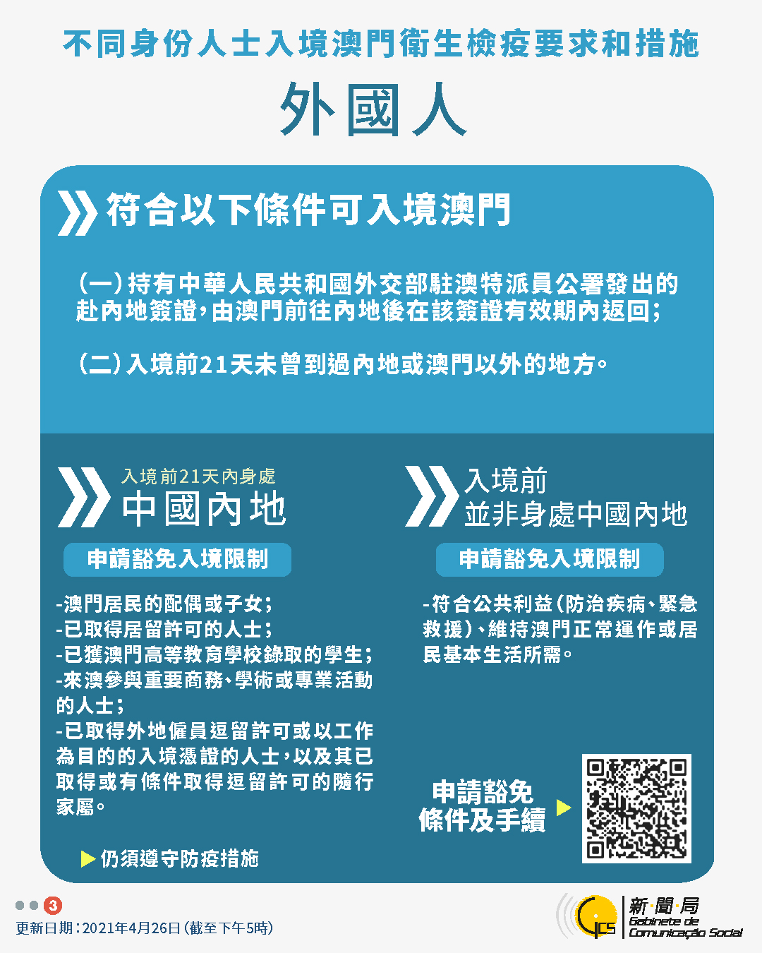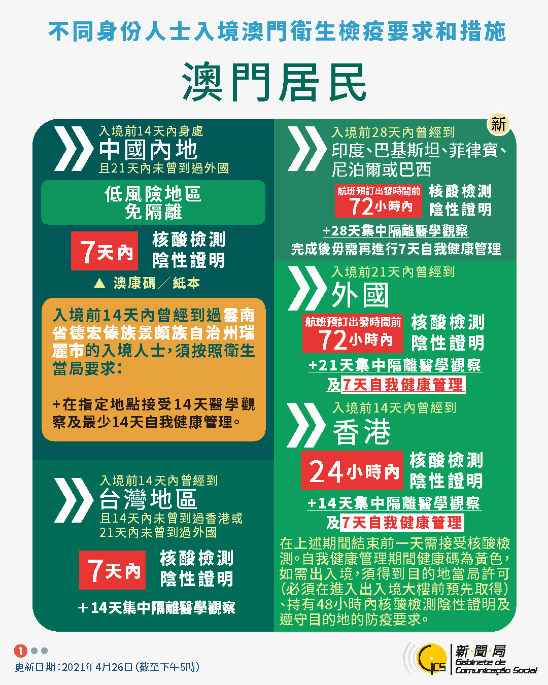 【圖文包】2021/4/26最新入境澳門衛生檢疫要求和措施